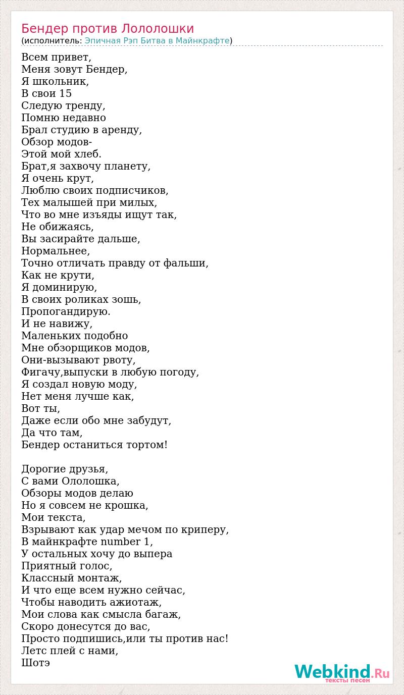 Всем привет, Меня зовут Бендер, Я школьник, В свои 15 Следую тренду, Помню недавно Брал студию в аренду, Обзор модов- Этой мой хлеб. Брат,я захвочу планету, Я очень крут, Люблю своих подписчиков, Тех малышей при милых, Что во мне изъяды ищут так, Не обижаясь, Вы засирайте дальше, Нормальнее, Точно отличать правду от фальши, Как не крути, Я доминирую, В своих роликах зошь, Пропогандирую. И не навижу, Маленьких подобно Мне обзорщиков модов, Они-вызывают рвоту, Фигачу,выпуски в любую погоду, Я создал новую моду, Нет меня лучше как, Вот ты, Даже если обо мне забудут, Да что там, Бендер останиться тортом! Дорогие друзья, С вами Ололошка, Обзоры модов делаю Но я совсем не крошка, Мои текста, Взрывают как удар мечом по криперу, В майнкрафте number 1, У остальных хочу до выпера Приятный голос, Классный монтаж, И что еще всем нужно сейчас, Чтобы наводить ажиотаж, Мои слова как смысла багаж, Скоро донесутся до вас, Просто подпишись,или ты против нас! Летс плей с нами, Шотэ