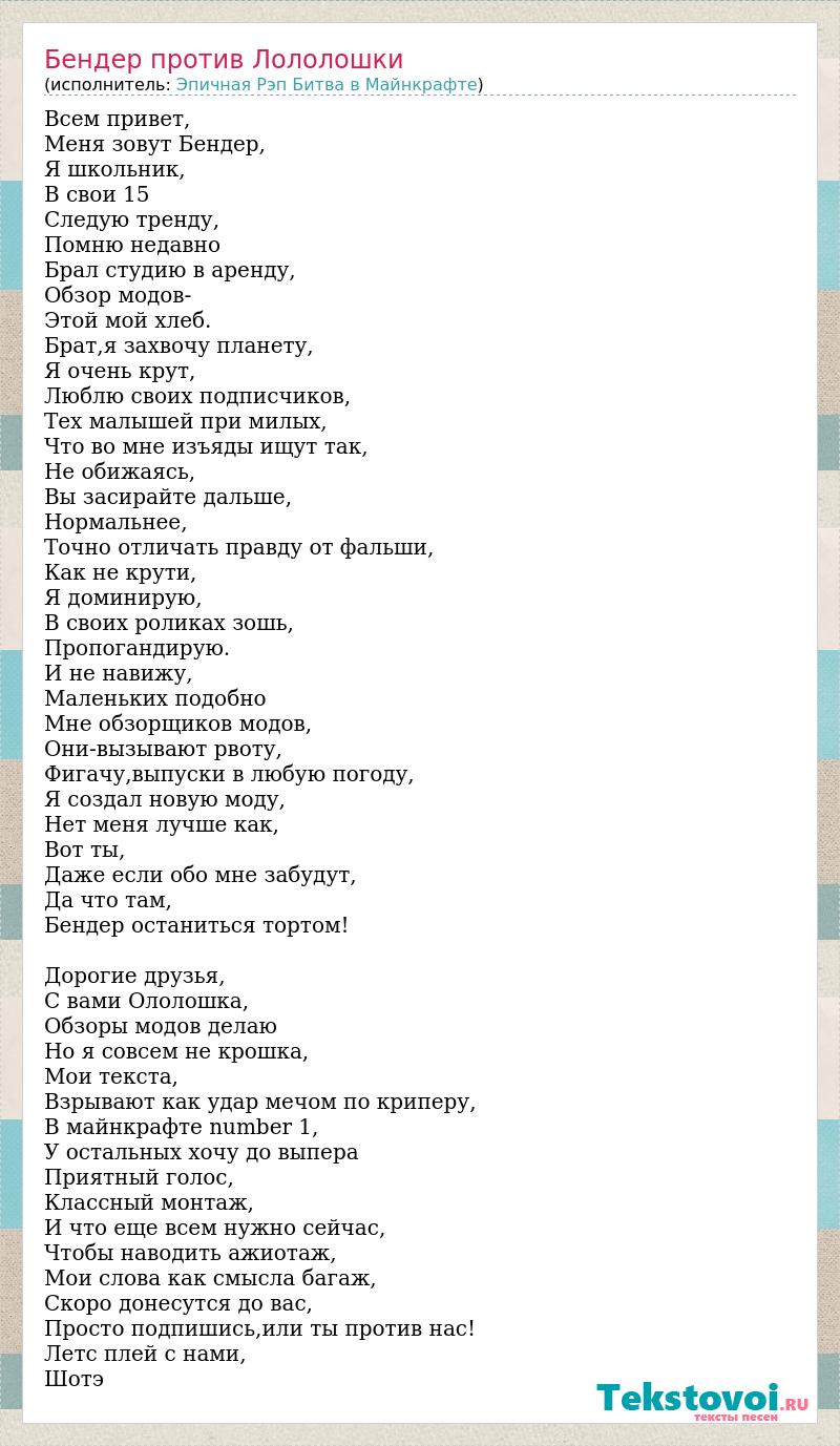 Всем привет, Меня зовут Бендер, Я школьник, В свои 15 Следую тренду, Помню недавно Брал студию в аренду, Обзор модов- Этой мой хлеб. Брат,я захвочу планету, Я очень крут, Люблю своих подписчиков, Тех малышей при милых, Что во мне изъяды ищут так, Не обижаясь, Вы засирайте дальше, Нормальнее, Точно отличать правду от фальши, Как не крути, Я доминирую, В своих роликах зошь, Пропогандирую. И не навижу, Маленьких подобно Мне обзорщиков модов, Они-вызывают рвоту, Фигачу,выпуски в любую погоду, Я создал новую моду, Нет меня лучше как, Вот ты, Даже если обо мне забудут, Да что там, Бендер останиться тортом! Дорогие друзья, С вами Ололошка, Обзоры модов делаю Но я совсем не крошка, Мои текста, Взрывают как удар мечом по криперу, В майнкрафте number 1, У остальных хочу до выпера Приятный голос, Классный монтаж, И что еще всем нужно сейчас, Чтобы наводить ажиотаж, Мои слова как смысла багаж, Скоро донесутся до вас, Просто подпишись,или ты против нас! Летс плей с нами, Шотэ