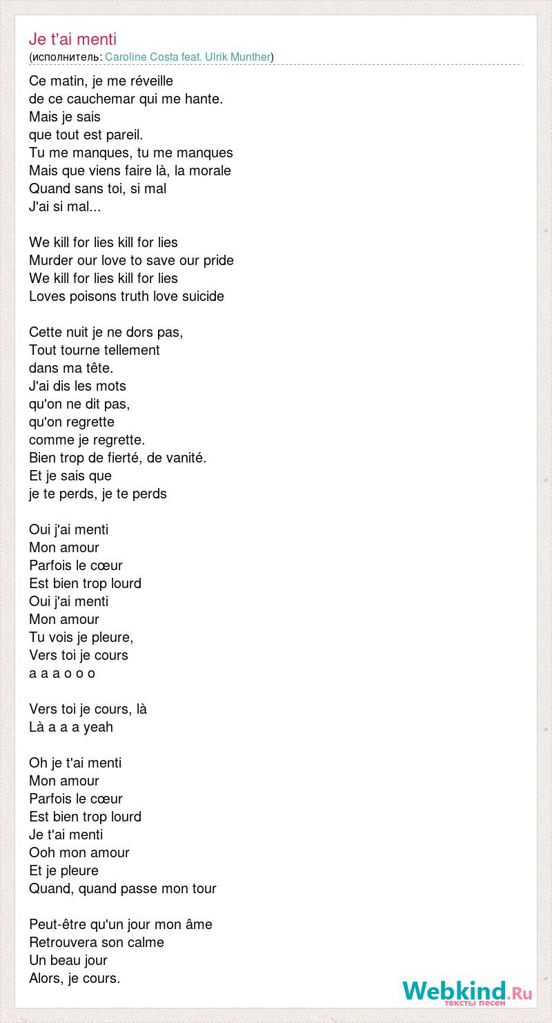 Ce matin, je me réveille de ce cauchemar qui me hante. Mais je sais que tout est pareil. Tu me manques, tu me manques Mais que viens faire là, la morale Quand sans toi, si mal J'ai si mal... We kill for lies kill for lies Murder our love to save our pride We kill for lies kill for lies Loves poisons truth love suicide Cette nuit je ne dors pas, Tout tourne tellement dans ma tête. J'ai dis les mots qu'on ne dit pas, qu'on regrette comme je regrette. Bien trop de fierté, de vanité. Et je sais que je te perds, je te perds Oui j'ai menti Mon amour Parfois le cœur Est bien trop lourd Oui j'ai menti Mon amour Tu vois je pleure, Vers toi je cours a a a o o o Vers toi je cours, là Là a a a yeah Oh je t'ai menti Mon amour Parfois le cœur Est bien trop lourd Je t'ai menti Ooh mon amour Et je pleure Quand, quand passe mon tour Peut-être qu'un jour mon âme Retrouvera son calme Un beau jour Alors, je cours.
