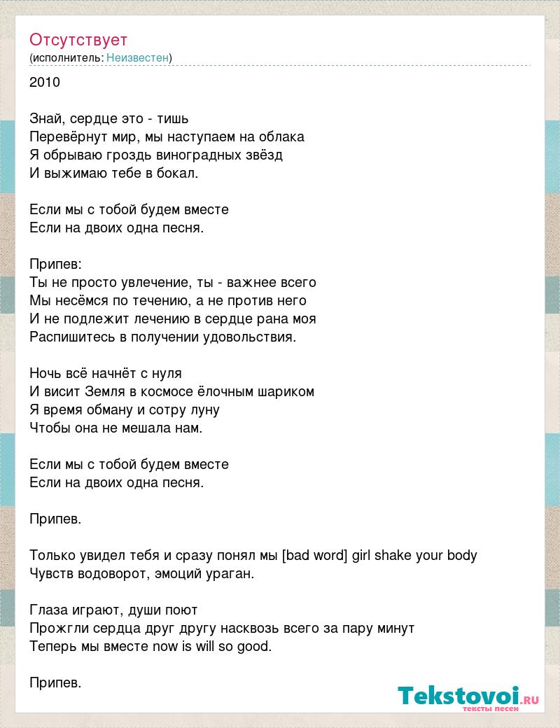 2010 Знай, сердце это - тишь Перевёрнут мир, мы наступаем на облака Я обрываю гроздь виноградных звёзд И выжимаю тебе в бокал. Если мы с тобой будем вместе Если на двоих одна песня. Припев: Ты не просто увлечение, ты - важнее всего Мы несёмся по течению, а не против него И не подлежит лечению в сердце рана моя Распишитесь в получении удовольствия. Ночь всё начнёт с нуля И висит Земля в космосе ёлочным шариком Я время обману и сотру луну Чтобы она не мешала нам. Если мы с тобой будем вместе Если на двоих одна песня. Припев. Только увидел тебя и сразу понял мы поладим Comon girl shake your body Чувств водоворот, эмоций ураган. Глаза играют, души поют Прожгли сердца друг другу насквозь всего за пару минут Теперь мы вместе now is will so good. Припев.