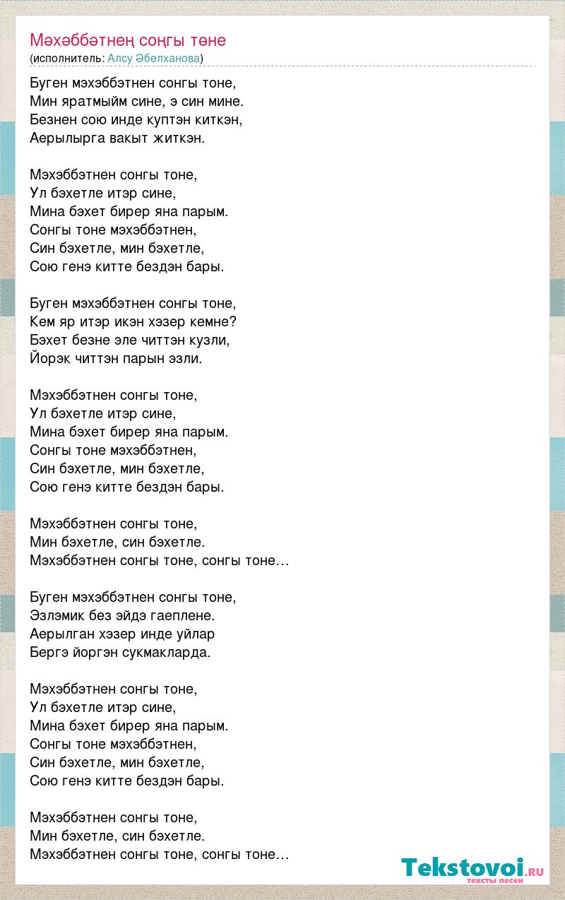 Буген мэхэббэтнен сонгы тоне, Мин яратмыйм сине, э син мине. Безнен сою инде куптэн киткэн, Аерылырга вакыт житкэн. Мэхэббэтнен сонгы тоне, Ул бэхетле итэр сине, Мина бэхет бирер яна парым. Сонгы тоне мэхэббэтнен, Син бэхетле, мин бэхетле, Сою генэ китте бездэн бары. Буген мэхэббэтнен сонгы тоне, Кем яр итэр икэн хэзер кемне? Бэхет безне эле читтэн кузли, Йорэк читтэн парын эзли. Мэхэббэтнен сонгы тоне, Ул бэхетле итэр сине, Мина бэхет бирер яна парым. Сонгы тоне мэхэббэтнен, Син бэхетле, мин бэхетле, Сою генэ китте бездэн бары. Мэхэббэтнен сонгы тоне, Мин бэхетле, син бэхетле. Мэхэббэтнен сонгы тоне, сонгы тоне… Буген мэхэббэтнен сонгы тоне, Эзлэмик без эйдэ гаеплене. Аерылган хэзер инде уйлар Бергэ йоргэн сукмакларда. Мэхэббэтнен сонгы тоне, Ул бэхетле итэр сине, Мина бэхет бирер яна парым. Сонгы тоне мэхэббэтнен, Син бэхетле, мин бэхетле, Сою генэ китте бездэн бары. Мэхэббэтнен сонгы тоне, Мин бэхетле, син бэхетле. Мэхэббэтнен сонгы тоне, сонгы тоне…
