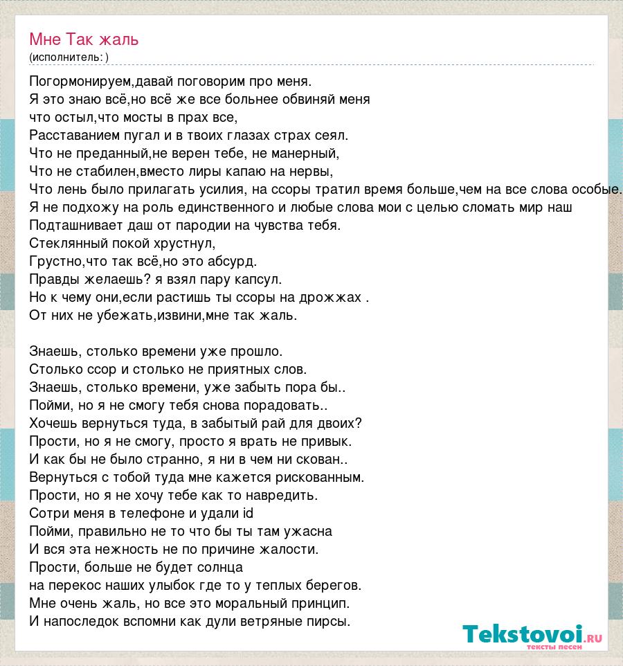 Погормонируем,давай поговорим про меня. Я это знаю всё,но всё же все больнее обвиняй меня что остыл,что мосты в прах все, Расставанием пугал и в твоих глазах страх сеял. Что не преданный,не верен тебе, не манерный, Что не стабилен,вместо лиры капаю на нервы, Что лень было прилагать усилия, на ссоры тратил время больше,чем на все слова особые. Я не подхожу на роль единственного и любые слова мои с целью сломать мир наш Подташнивает даш от пародии на чувства тебя. Стеклянный покой хрустнул, Грустно,что так всё,но это абсурд. Правды желаешь? я взял пару капсул. Но к чему они,если растишь ты ссоры на дрожжах . От них не убежать,извини,мне так жаль. Знаешь, столько времени уже прошло. Столько ссор и столько не приятных слов. Знаешь, столько времени, уже забыть пора бы.. Пойми, но я не смогу тебя снова порадовать.. Хочешь вернуться туда, в забытый рай для двоих? Прости, но я не смогу, просто я врать не привык. И как бы не было странно, я ни в чем ни скован.. Вернуться с тобой туда мне кажется рискованным. Прости, но я не хочу тебе как то навредить. Сотри меня в телефоне и удали id Пойми, правильно не то что бы ты там ужасна И вся эта нежность не по причине жалости. Прости, больше не будет солнца на перекос наших улыбок где то у теплых берегов. Мне очень жаль, но все это моральный принцип. И напоследок вспомни как дули ветряные пирсы.