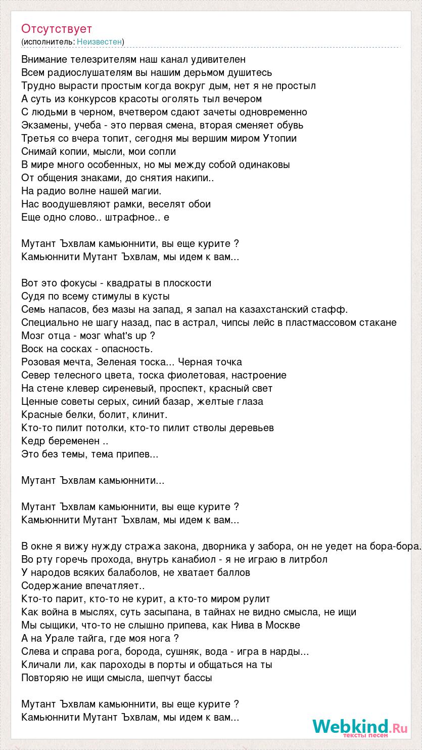 Внимание телезрителям наш канал удивителен Всем радиослушателям вы нашим дерьмом душитесь Трудно вырасти простым когда вокруг дым, нет я не простыл А суть из конкурсов красоты оголять тыл вечером С людьми в черном, вчетвером сдают зачеты одновременно Экзамены, учеба - это первая смена, вторая сменяет обувь Третья со вчера топит, сегодня мы вершим миром Утопии Снимай копии, мысли, мои сопли В мире много особенных, но мы между собой одинаковы От общения знаками, до снятия накипи.. На радио волне нашей магии. Нас воодушевляют рамки, веселят обои Еще одно слово.. штрафное.. е Мутант Ъхвлам камьюннити, вы еще курите ? Камьюннити Мутант Ъхвлам, мы идем к вам... Вот это фокусы - квадраты в плоскости Судя по всему стимулы в кусты Семь напасов, без мазы на запад, я запал на казахстанский стафф. Специально не шагу назад, пас в астрал, чипсы лейс в пластмассовом стакане Мозг отца - мозг what's up ? Воск на сосках - опасность. Розовая мечта, Зеленая тоска... Черная точка Север телесного цвета, тоска фиолетовая, настроение На стене клевер сиреневый, проспект, красный свет Ценные советы серых, синий базар, желтые глаза Красные белки, болит, клинит. Кто-то пилит потолки, кто-то пилит стволы деревьев Кедр беременен .. Это без темы, тема припев... Мутант Ъхвлам камьюннити... Мутант Ъхвлам камьюннити, вы еще курите ? Камьюннити Мутант Ъхвлам, мы идем к вам... В окне я вижу нужду стража закона, дворника у забора, он не уедет на бора-бора. Во рту горечь прохода, внутрь канабиол - я не играю в литрбол У народов всяких балаболов, не хватает баллов Содержание впечатляет.. Кто-то парит, кто-то не курит, а кто-то миром рулит Как война в мыслях, суть засыпана, в тайнах не видно смысла, не ищи Мы сыщики, что-то не слышно припева, как Нива в Москве А на Урале тайга, где моя нога ? Слева и справа рога, борода, сушняк, вода - игра в нарды... Кличали ли, как пароходы в порты и общаться на ты Повторяю не ищи смысла, шепчут бассы Мутант Ъхвлам камьюннити, вы еще курите ? Камьюннити Мутант Ъхвлам, мы идем к вам...