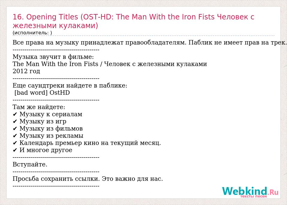 Все права на музыку принадлежат правообладателям. Паблик не имеет прав на трек. ------------------------------------------- Музыка звучит в фильме: The Man With the Iron Fists / Человек с железными кулаками 2012 год ------------------------------------------- Еще саундтреки найдете в паблике: [bad word] OstHD ------------------------------------------- Там же найдете: ✔ Музыку к сериалам ✔ Музыку из игр ✔ Музыку из фильмов ✔ Музыку из рекламы ✔ Календарь премьер кино на текущий месяц. ✔ И многое другое ------------------------------------------- Вступайте. ------------------------------------------- Просьба сохранить ссылки. Это важно для нас. -------------------------------------------