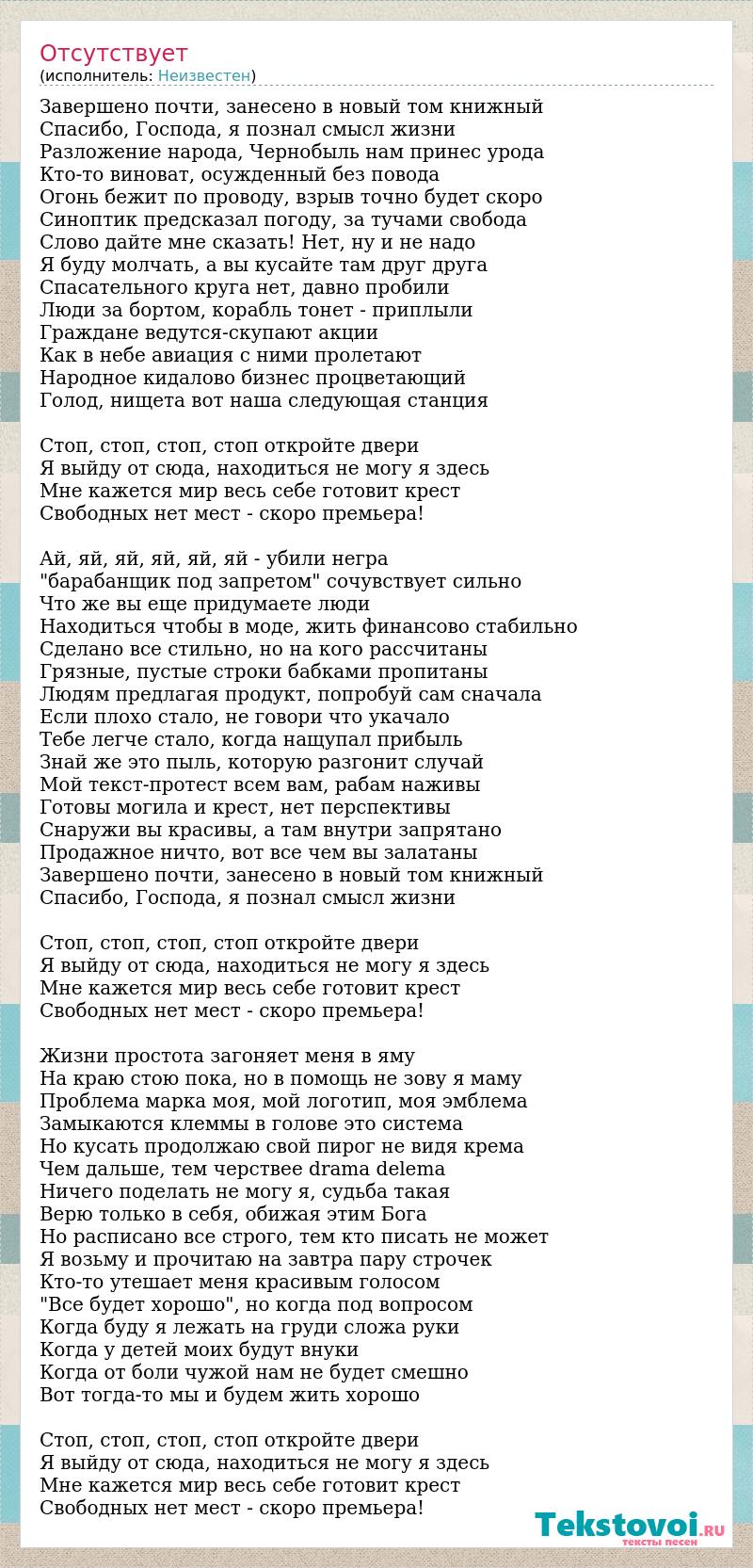 Завершено почти, занесено в новый том книжный Спасибо, Господа, я познал смысл жизни Разложение народа, Чернобыль нам принес урода Кто-то виноват, осужденный без повода Огонь бежит по проводу, взрыв точно будет скоро Синоптик предсказал погоду, за тучами свобода Слово дайте мне сказать! Нет, ну и не надо Я буду молчать, а вы кусайте там друг друга Спасательного круга нет, давно пробили Люди за бортом, корабль тонет - приплыли Граждане ведутся-скупают акции Как в небе авиация с ними пролетают Народное кидалово бизнес процветающий Голод, нищета вот наша следующая станция Стоп, стоп, стоп, стоп откройте двери Я выйду от сюда, находиться не могу я здесь Мне кажется мир весь себе готовит крест Свободных нет мест - скоро премьера! Ай, яй, яй, яй, яй, яй - убили негра "барабанщик под запретом" сочувствует сильно Что же вы еще придумаете люди Находиться чтобы в моде, жить финансово стабильно Сделано все стильно, но на кого рассчитаны Грязные, пустые строки бабками пропитаны Людям предлагая продукт, попробуй сам сначала Если плохо стало, не говори что укачало Тебе легче стало, когда нащупал прибыль Знай же это пыль, которую разгонит случай Мой текст-протест всем вам, рабам наживы Готовы могила и крест, нет перспективы Снаружи вы красивы, а там внутри запрятано Продажное ничто, вот все чем вы залатаны Завершено почти, занесено в новый том книжный Спасибо, Господа, я познал смысл жизни Стоп, стоп, стоп, стоп откройте двери Я выйду от сюда, находиться не могу я здесь Мне кажется мир весь себе готовит крест Свободных нет мест - скоро премьера! Жизни простота загоняет меня в яму На краю стою пока, но в помощь не зову я маму Проблема марка моя, мой логотип, моя эмблема Замыкаются клеммы в голове это система Но кусать продолжаю свой пирог не видя крема Чем дальше, тем черствее drama delema Ничего поделать не могу я, судьба такая Верю только в себя, обижая этим Бога Но расписано все строго, тем кто писать не может Я возьму и прочитаю на завтра пару строчек Кто-то утешает меня красивым голосом "Все будет хорошо", но когда под вопросом Когда буду я лежать на груди сложа руки Когда у детей моих будут внуки Когда от боли чужой нам не будет смешно Вот тогда-то мы и будем жить хорошо Стоп, стоп, стоп, стоп откройте двери Я выйду от сюда, находиться не могу я здесь Мне кажется мир весь себе готовит крест Свободных нет мест - скоро премьера!
