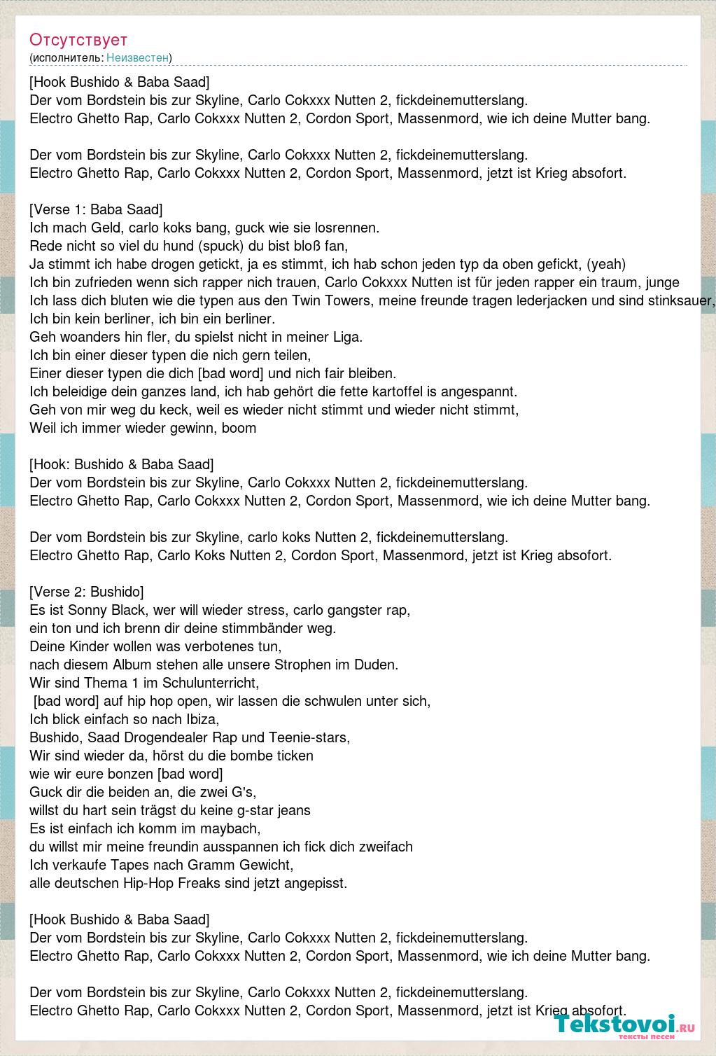 [Hook Bushido & Baba Saad] Der vom Bordstein bis zur Skyline, Carlo Cokxxx Nutten 2, fickdeinemutterslang. Electro Ghetto Rap, Carlo Cokxxx Nutten 2, Cordon Sport, Massenmord, wie ich deine Mutter bang. Der vom Bordstein bis zur Skyline, Carlo Cokxxx Nutten 2, fickdeinemutterslang. Electro Ghetto Rap, Carlo Cokxxx Nutten 2, Cordon Sport, Massenmord, jetzt ist Krieg absofort. [Verse 1: Baba Saad] Ich mach Geld, carlo koks bang, guck wie sie losrennen. Rede nicht so viel du hund (spuck) du bist bloß fan, Ja stimmt ich habe drogen getickt, ja es stimmt, ich hab schon jeden typ da oben gefickt, (yeah) Ich bin zufrieden wenn sich rapper nich trauen, Carlo Cokxxx Nutten ist für jeden rapper ein traum, junge Ich lass dich bluten wie die typen aus den Twin Towers, meine freunde tragen lederjacken und sind stinksauer, Ich bin kein berliner, ich bin ein berliner. Geh woanders hin fler, du spielst nicht in meiner Liga. Ich bin einer dieser typen die nich gern teilen, Einer dieser typen die dich [bad word] und nich fair bleiben. Ich beleidige dein ganzes land, ich hab gehört die fette kartoffel is angespannt. Geh von mir weg du keck, weil es wieder nicht stimmt und wieder nicht stimmt, Weil ich immer wieder gewinn, boom [Hook: Bushido & Baba Saad] Der vom Bordstein bis zur Skyline, Carlo Cokxxx Nutten 2, fickdeinemutterslang. Electro Ghetto Rap, Carlo Cokxxx Nutten 2, Cordon Sport, Massenmord, wie ich deine Mutter bang. Der vom Bordstein bis zur Skyline, carlo koks Nutten 2, fickdeinemutterslang. Electro Ghetto Rap, Carlo Koks Nutten 2, Cordon Sport, Massenmord, jetzt ist Krieg absofort. [Verse 2: Bushido] Es ist Sonny Black, wer will wieder stress, carlo gangster rap, ein ton und ich brenn dir deine stimmbänder weg. Deine Kinder wollen was verbotenes tun, nach diesem Album stehen alle unsere Strophen im Duden. Wir sind Thema 1 im Schulunterricht, [bad word] auf hip hop open, wir lassen die schwulen unter sich, Ich blick einfach so nach Ibiza, Bushido, Saad Drogendealer Rap und Teenie-stars, Wir sind wieder da, hörst du die bombe ticken wie wir eure bonzen [bad word] Guck dir die beiden an, die zwei G's, willst du hart sein trägst du keine g-star jeans Es ist einfach ich komm im maybach, du willst mir meine freundin ausspannen ich fick dich zweifach Ich verkaufe Tapes nach Gramm Gewicht, alle deutschen Hip-Hop Freaks sind jetzt angepisst. [Hook Bushido & Baba Saad] Der vom Bordstein bis zur Skyline, Carlo Cokxxx Nutten 2, fickdeinemutterslang. Electro Ghetto Rap, Carlo Cokxxx Nutten 2, Cordon Sport, Massenmord, wie ich deine Mutter bang. Der vom Bordstein bis zur Skyline, Carlo Cokxxx Nutten 2, fickdeinemutterslang. Electro Ghetto Rap, Carlo Cokxxx Nutten 2, Cordon Sport, Massenmord, jetzt ist Krieg absofort.