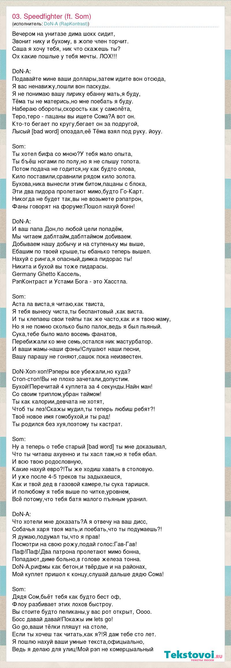 Вечером на унитазе дима шокк сидит, Звонит нику и бухому, в жопе член торчит. Саша я хочу тебя, ник что скажешь ты? Ох какие пошлые у тебя мечты. ЛОХ!!! DoN-A: Подавайте мине ваши доллары,затем идите вон отсюда, Я вас ненавижу,пошли вон паскуды. Я не понимаю вашу лирику ебанну мать,я буду, Тёма ты не матерись,но мне поебать я буду. Набераю обороты,скорость как у самолёта, Теро,теро - пацаны вы ищете Сома?А вот он. Кто-то бегает по кругу,бегает он за подругой, Лысый [bad word] опоздал,её Тёма взял под руку. йоуу. Som: Ты хотел бифа со мною?У тебя мало опыта, Ты бъёш ногами по полу,но я не слышу топота. Потом подача не годится,ну как будто олова, Кило поставили,сравнили рядом кило золота. Бухова,ника вынесли этим битом,пацаны с блока, Эти два пидора пролетают мимо,будто Го-Карт. Никогда не будет так,вы не возьмете рэпатрон, Фаны говорят на форуме:Пошол нахуй бонн! DoN-A: И ваш папа Дон,по любой цели попадём, Мы читаем даблтайм,даблтаймом добиваем. Добываем нашу добычу и на ступеньку мы выше, Ебашим по твоей крыше,ты ебанько теперь вышел. Нахуй с ринга,я опасный,димка пидорас ты! Никита и бухой вы тоже пидарасы. Germany Ghetto Кассель, РэпКонтраст и Устами Бога - это Хасстла. Som: Аста ла виста,я читаю,как твиста, Я тебя вынесу чиста,ты беспантовый ,как виста. И ты клепаеш свои тейпы так же часто,как и я твою маму, Но я не помню сколько было палок,ведь я был пьяный. Сука,тебе было мало восемь фанатов, Перебижали ко мне семь,остался ник мастурбатор. И ваши мамы-наши фэны!Слушают наши песни, Вашу парашу не гоняют,сашок пока неизвестен. DoN-Хоп-хоп!Рэперы все убежали,но куда? Стоп-стоп!Вы не плохо зачетали,допустим. Бухой!Перечитай 4 куплета за 4 секунды.Найн ман! Со своим триплом,убран таймом! Ты как калории,девчата не хотят, Чтоб ты лез!Скажы мудил,ты теперь любиш ребят?! Твоё новое имя гомобухой,и ты рад! Ты родился без хуя,поэтому ты кастрат. Som: Ну а теперь о тебе старый [bad word] ты мне доказывал, Что ты читаеш ахуенно и ты хасл там,но я тебя ебал. И всю твою родословную, Какие нахуй евро?!Ты же ходиш хавать в столовую. И уже после 4-5 треков ты задыхаешся, Как и твой дед в газовой камере,ты сука таришся. И полюбому я тебя выше по читке,уровнем, Всё потому,что тебя батя малого пъяным уранил. DoN-A: Что хотели мне доказать?А я отвечу на ваш дисс, Собачья харя твоя мать,и поебать,что ты подумаешь?! Я думаю,подумал ты,что я прав! Посмотри на свою рожу,подай голос:Гав-Гав! Паф!Паф!Два патрона пролетают мимо бонна, Попадают,диме больно,в голове железа тонна. DoN-A,рифмы как бетон,и твёрдые и на районах, Мой куплет пришол к концу,слушай дальше дядю Сома! Som: Дядя Сом,бьёт тебя как будто бест оф, Флоу разбивает этих лохов быстроу. Вы стоите будто пеликаны,у вас рот открыт, Оооо. Босс давай давай!Покажы им lets go! Go go,ваши тёлки пляшут на столе, Если ты хочеш так читать,как я?!Я дам тебе сто лет. Я пошлю нахуй ваши умные текста,офицыально, Ведь я делаю для улиц!Мой рэп не комерцыальный