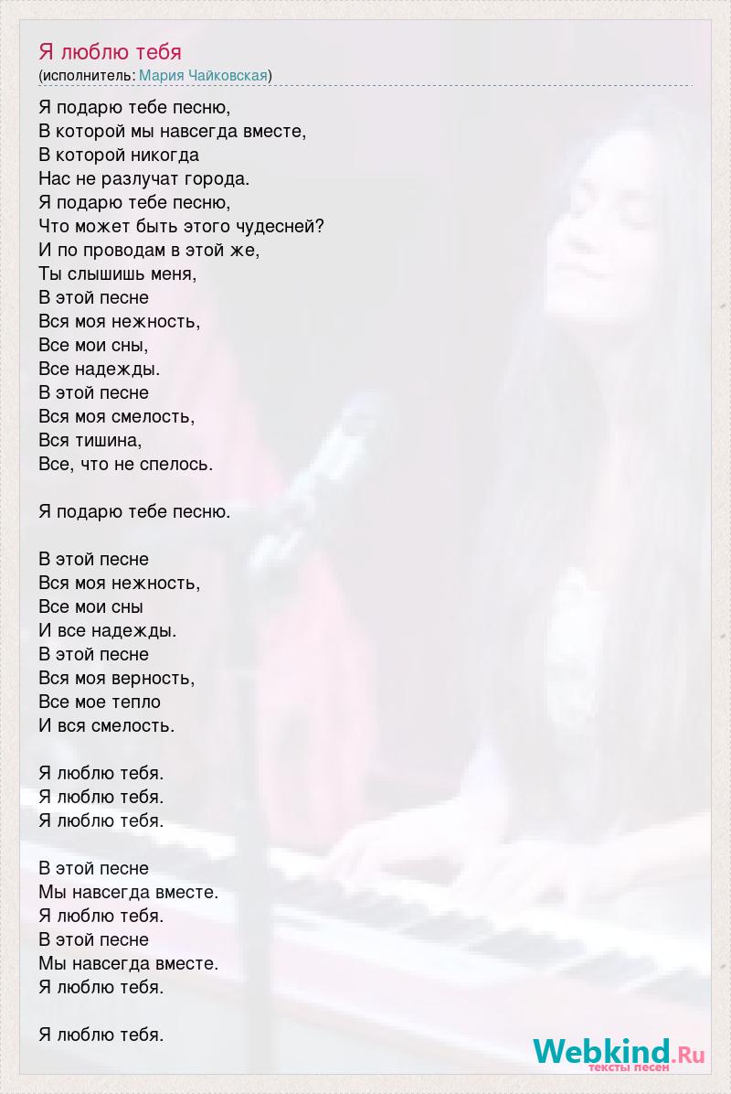 Я подарю тебе песню, В которой мы навсегда вместе, В которой никогда Нас не разлучат города. Я подарю тебе песню, Что может быть этого чудесней? И по проводам в этой же, Ты слышишь меня, В этой песне Вся моя нежность, Все мои сны, Все надежды. В этой песне Вся моя смелость, Вся тишина, Все, что не спелось. Я подарю тебе песню. В этой песне Вся моя нежность, Все мои сны И все надежды. В этой песне Вся моя верность, Все мое тепло И вся смелость. Я люблю тебя. Я люблю тебя. Я люблю тебя. В этой песне Мы навсегда вместе. Я люблю тебя. В этой песне Мы навсегда вместе. Я люблю тебя. Я люблю тебя.
