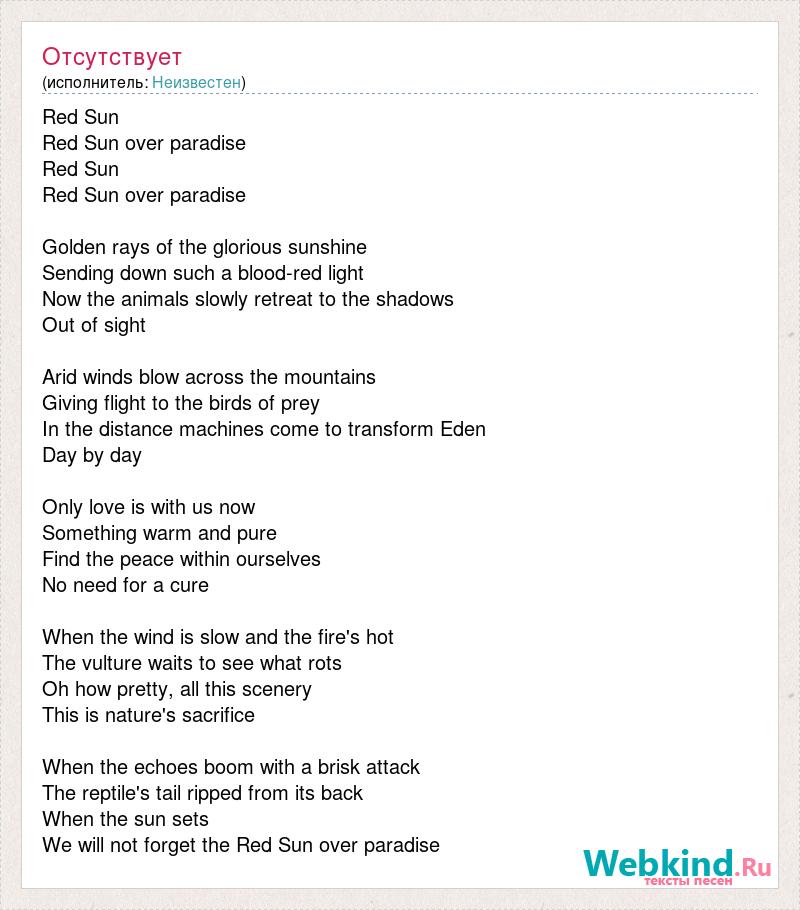 Red Sun Red Sun over paradise Red Sun Red Sun over paradise Golden rays of the glorious sunshine Sending down such a blood-red light Now the animals slowly retreat to the shadows Out of sight Arid winds blow across the mountains Giving flight to the birds of prey In the distance machines come to transform Eden Day by day Only love is with us now Something warm and pure Find the peace within ourselves No need for a cure When the wind is slow and the fire's hot The vulture waits to see what rots Oh how pretty, all this scenery This is nature's sacrifice When the echoes boom with a brisk attack The reptile's tail ripped from its back When the sun sets We will not forget the Red Sun over paradise