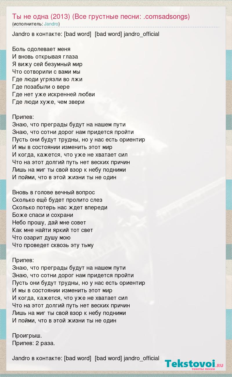Jandro в контакте: [bad word] [bad word] jandro_official Боль одолевает меня И вновь открывая глаза Я вижу сей безумный мир Что сотворили с вами мы Где люди угрязли во лжи Где позабыли о вере Где нет уже искренней любви Где люди хуже, чем звери Припев: Знаю, что преграды будут на нашем пути Знаю, что сотни дорог нам придется пройти Пусть они будут трудны, но у нас есть ориентир И мы в состоянии изменить этот мир И когда, кажется, что уже не хватает сил Что на этот долгий путь нет веских причин Лишь на миг ты свой взор к небу подними И пойми, что в этой жизни ты не один Вновь в голове вечный вопрос Сколько ещё будет пролито слез Сколько потерь нас ждет впереди Боже спаси и сохрани Небо прошу, дай мне совет Как мне найти яркий тот свет Что озарит душу мою Что проведет сквозь эту тьму Припев: Знаю, что преграды будут на нашем пути Знаю, что сотни дорог нам придется пройти Пусть они будут трудны, но у нас есть ориентир И мы в состоянии изменить этот мир И когда, кажется, что уже не хватает сил Что на этот долгий путь нет веских причин Лишь на миг ты свой взор к небу подними И пойми, что в этой жизни ты не один Проигрыш. Припев: 2 раза. Jandro в контакте: [bad word] [bad word] jandro_official