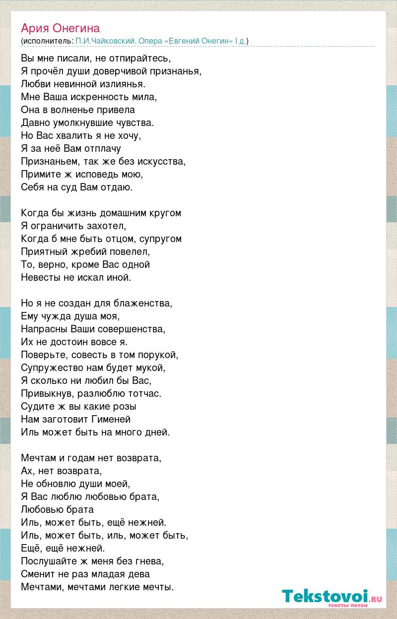 Вы мне писали, не отпирайтесь, Я прочёл души доверчивой признанья, Любви невинной излиянья. Мне Ваша искренность мила, Она в волненье привела Давно умолкнувшие чувства. Но Вас хвалить я не хочу, Я за неё Вам отплачу Признаньем, так же без искусства, Примите ж исповедь мою, Себя на суд Вам отдаю. Когда бы жизнь домашним кругом Я ограничить захотел, Когда б мне быть отцом, супругом Приятный жребий повелел, То, верно, кроме Вас одной Невесты не искал иной. Но я не создан для блаженства, Ему чужда душа моя, Напрасны Ваши совершенства, Их не достоин вовсе я. Поверьте, совесть в том порукой, Супружество нам будет мукой, Я сколько ни любил бы Вас, Привыкнув, разлюблю тотчас. Судите ж вы какие розы Нам заготовит Гименей Иль может быть на много дней. Мечтам и годам нет возврата, Ах, нет возврата, Не обновлю души моей, Я Вас люблю любовью брата, Любовью брата Иль, может быть, ещё нежней. Иль, может быть, иль, может быть, Ещё, ещё нежней. Послушайте ж меня без гнева, Сменит не раз младая дева Мечтами, мечтами легкие мечты.