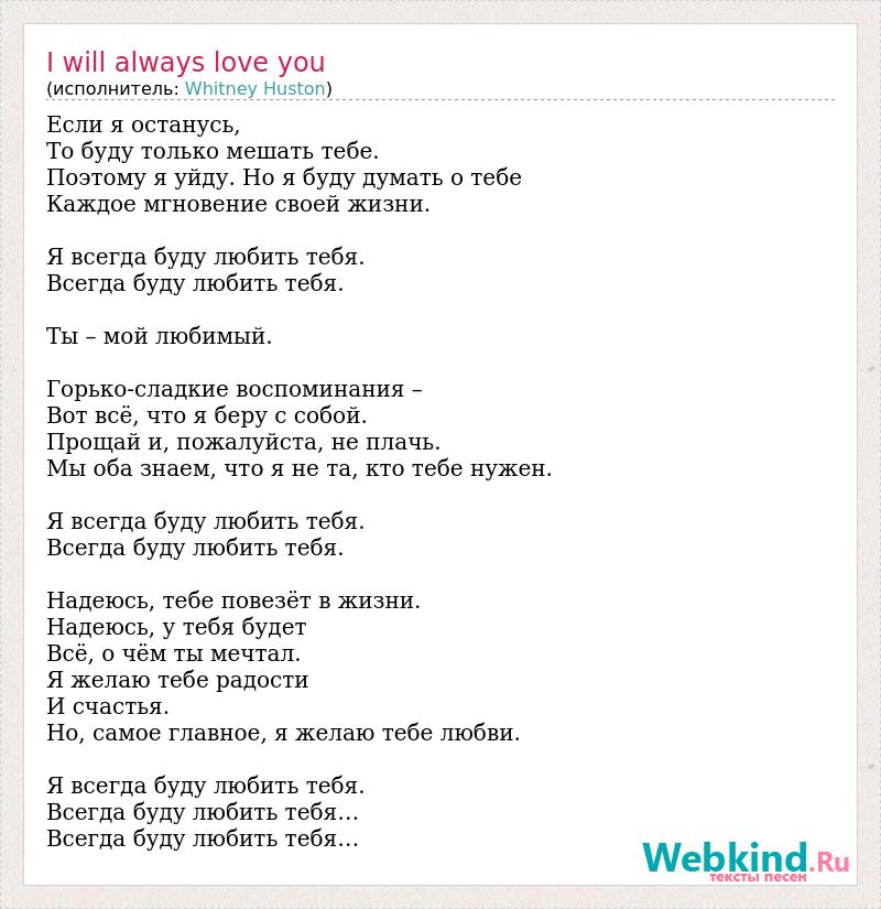 Если я останусь, То буду только мешать тебе. Поэтому я уйду. Но я буду думать о тебе Каждое мгновение своей жизни. Я всегда буду любить тебя. Всегда буду любить тебя. Ты – мой любимый. Горько-сладкие воспоминания – Вот всё, что я беру с собой. Прощай и, пожалуйста, не плачь. Мы оба знаем, что я не та, кто тебе нужен. Я всегда буду любить тебя. Всегда буду любить тебя. Надеюсь, тебе повезёт в жизни. Надеюсь, у тебя будет Всё, о чём ты мечтал. Я желаю тебе радости И счастья. Но, самое главное, я желаю тебе любви. Я всегда буду любить тебя. Всегда буду любить тебя… Всегда буду любить тебя…