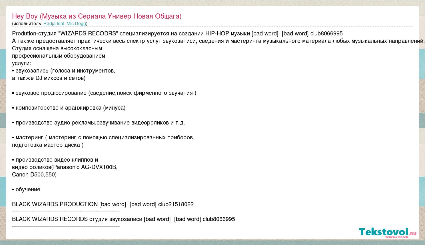 Prodution-студия "WIZARDS RECODRS" специализируется на создании HIP-HOP музыки [bad word] [bad word] club8066995 А также предоставляет практически весь спектр услуг звукозаписи, сведения и мастеринга музыкального материала любых музыкальных направлений. Студия оснащена высококласным професиональным оборудованием услуги: ▪ звукозапись (голоса и инструментов, а также DJ миксов и сетов) ▪ звуковое продюсирование (сведение,поиск фирменного звучания ) ▪ композиторство и аранжировка (минуса) ▪ производство аудио рекламы,озвучивание видеороликов и т.д. ▪ мастеринг ( мастеринг с помощью специализированных приборов, подготовка мастер диска ) ▪ производство видео клиппов и видео роликов(Panasonic AG-DVX100B, Canon D500,550) ▪ обучение BLACK WIZARDS PRODUCTION [bad word] [bad word] club21518022 ------------------------------------------------------ BLACK WIZARDS RECORDS студия звукозаписи [bad word] [bad word] club8066995 ------------------------------------------------------