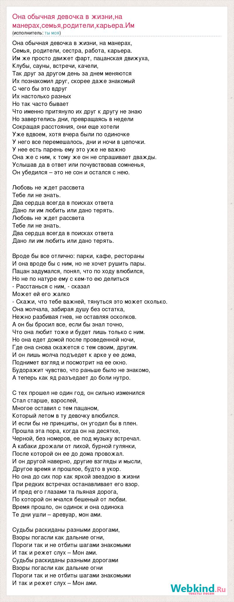 Она обычная девочка в жизни, на манерах, Семья, родители, сестра, работа, карьера. Им же просто движет фарт, пацанская движуха, Клубы, сауны, встречи, качели, Так друг за другом день за днем меняются Их познакомил друг, скорее даже знакомый С чего бы это вдруг Их настолько разных Но так часто бывает Что именно притянуло их друг к другу не знаю Но завертелись дни, превращаясь в недели Сокращая расстояния, они еще хотели Уже вдвоем, хотя вчера были по одиночке У него все перемешалось, дни и ночи в цепочки. У нее есть парень ему это уже не важно Она же с ним, к тому же он не спрашивает дважды. Услышав да в ответ или почувствовав сомненья, Он убедился – это не сон и остался с нею. Любовь не ждет рассвета Тебе ли не знать. Два сердца всегда в поисках ответа Дано ли им любить или дано терять. Любовь не ждет рассвета Тебе ли не знать. Два сердца всегда в поисках ответа Дано ли им любить или дано терять. Вроде бы все отлично: парки, кафе, рестораны И она вроде бы с ним, но не хочет рушить пары. Пацан задумался, понял, что по ходу влюбился, Но не по натуре ему с кем-то ею делиться - Расстанься с ним, - сказал Может ей его жалко - Скажи, что тебе важней, тянуться это может сколько. Она молчала, забирая душу без остатка, Нежно разбивая гнев, не оставляя осколков. А он бы бросил все, если бы знал точно, Что она любит тоже и будет лишь только с ним. Но она едет домой после проведенной ночи, Где она снова окажется с тем своим, другим. И он лишь молча подъедет к арке у ее дома, Поднимет взгляд и посмотрит на ее окно. Будоражит чувство, что раньше было не знакомо, А теперь как яд разъедает до боли нутро. С тех прошел не один год, он сильно изменился Стал старше, взрослей, Многое оставил с тем пацаном, Который летом в ту девочку влюбился. И если бы не принципы, он угодил бы в плен. Прошла эта пора, когда он на десятке, Черной, без номеров, ее под музыку встречал. А кабаки дрожали от лихой, бурной гулянки, После которой он ее до дома провожал. И он другой наверно, другие взгляды и мысли, Другое время и прошлое, будто в укор. Но она до сих пор как яркой звездою в жизни При редких встречах останавливает его взор. И пред его глазами та пьяная дорога, По которой он мчался бешеный от любви. Время прошло, он одинок и она одинока Те дни ушли – аревуар, мон ами. Судьбы раскиданы разными дорогами, Взоры погасли как дальние огни, Пороги так и не отбиты шагами знакомыми И так и режет слух – Мон ами. Судьбы раскиданы разными дорогами Взоры погасли как дальние огни Пороги так и не отбиты шагами знакомыми И так и режет слух – Мон ами.