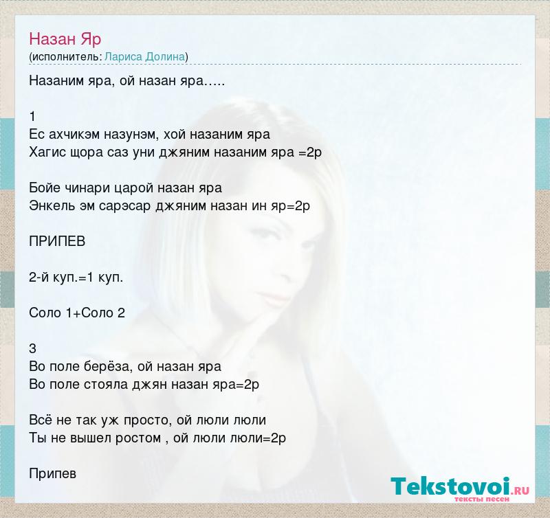 Назаним яра, ой назан яра….. 1 Ес ахчикэм назунэм, хой назаним яра Хагис щора саз уни джяним назаним яра =2р Бойе чинари царой назан яра Энкель эм сарэсар джяним назан ин яр=2р ПРИПЕВ 2-й куп.=1 куп. Соло 1+Соло 2 3 Во поле берёза, ой назан яра Во поле стояла джян назан яра=2р Всё не так уж просто, ой люли люли Ты не вышел ростом , ой люли люли=2р Припев