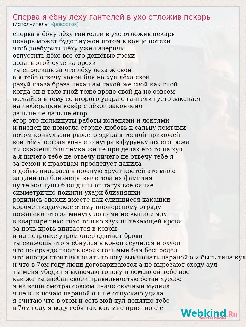 сперва я ёбну лёху гантелей в ухо отложив пекарь пекарь может будет нужен потом в конце потехи чтоб доебурить лёху уже наверняк отпустить лёхе все его дешёвые грехи додать этой суке на орехи ты спросишь за что лёху леха ж свой а я тебе отвечу какой бля на хуй лёха свой разуй глаза браза лёха нам такой же свой как гной когда он в теле гной тоже вроде свой да не совсем всекайся в тему со второго удара с гантели густо закапает на люберецкий ковёр с лёхой закончено дальше чё дальше егор егор это полминуты работы коленями и локтями и пиздец не помогла егорке любовь к сальцу ломтями потом конвульсии рыжего эдика в тесной прихожей вой тёмы острая вонь его нутра в фурункулах его рожа ты скажешь бля тёмка же не при делах его то на хуя а я ничего тебе не отвечу ничего не отвечу тебе я за темой к праотцам проследует данила я добью пидараса в ножную хруст костей это мило за данилой близнецы вылетела их фамилия ну те молчуны блондины от татух все синие симметрично пожили ухари близняшки родились сдохли вместе как слипшиеся какашки короче пиздаускас этому пионерскому отряду пожалеют что за минуту до сами не выпили яду в квартире тихо тихо только звук вытекающей крови за ночь кровь впитается в ковры и на петровке утром опер сдвинет брови ты скажешь что я ебнулся в конец ссучился и охуел что по ерунде гасить своих голимый бля беспредел что иногда стоит включать голову выключать паранойю и быть типа кул и что в 7ом году люди договариваются а не вырезают сходу аул ты меня убедил я включаю голову и ломаю ей тебе нос как же ты заебал своей правильностью ботан хуесос я на вещи смотрю совсем иначе скучный мудила я не выключаю паранойю я не отпускаю удила я считаю что в этом и есть мой кул понятно тебе в 7ом году я веду себя так как мне приятно е е