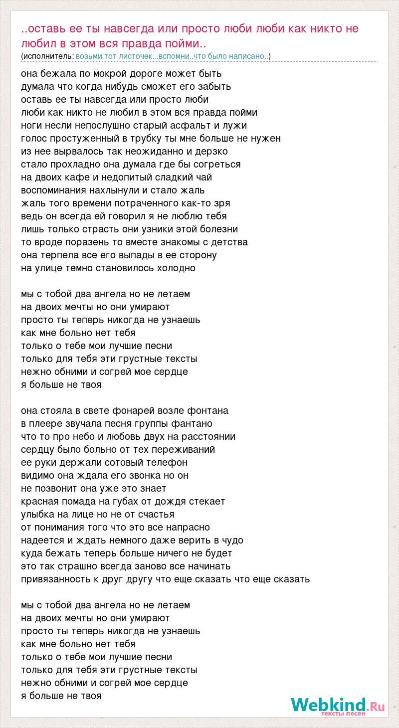 она бежала по мокрой дороге может быть думала что когда нибудь сможет его забыть оставь ее ты навсегда или просто люби люби как никто не любил в этом вся правда пойми ноги несли непослушно старый асфальт и лужи голос простуженный в трубку ты мне больше не нужен из нее вырвалось так неожиданно и дерзко стало прохладно она думала где бы согреться на двоих кафе и недопитый сладкий чай воспоминания нахлынули и стало жаль жаль того времени потраченного как-то зря ведь он всегда ей говорил я не люблю тебя лишь только страсть они узники этой болезни то вроде поразень то вместе знакомы с детства она терпела все его выпады в ее сторону на улице темно становилось холодно мы с тобой два ангела но не летаем на двоих мечты но они умирают просто ты теперь никогда не узнаешь как мне больно нет тебя только о тебе мои лучшие песни только для тебя эти грустные тексты нежно обними и согрей мое сердце я больше не твоя она стояла в свете фонарей возле фонтана в плеере звучала песня группы фантано что то про небо и любовь двух на расстоянии сердцу было больно от тех переживаний ее руки держали сотовый телефон видимо она ждала его звонка но он не позвонит она уже это знает красная помада на губах от дождя стекает улыбка на лице но не от счастья от понимания того что это все напрасно надеется и ждать немного даже верить в чудо куда бежать теперь больше ничего не будет это так страшно всегда заново все начинать привязанность к друг другу что еще сказать что еще сказать мы с тобой два ангела но не летаем на двоих мечты но они умирают просто ты теперь никогда не узнаешь как мне больно нет тебя только о тебе мои лучшие песни только для тебя эти грустные тексты нежно обними и согрей мое сердце я больше не твоя