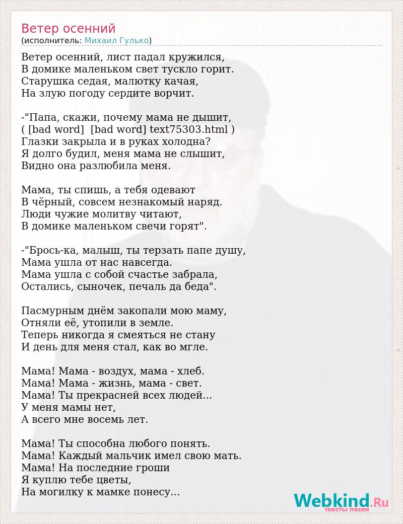 Ветер осенний, лист падал кружился, В домике маленьком свет тускло горит. Старушка седая, малютку качая, На злую погоду сердите ворчит. -"Папа, скажи, почему мама не дышит, ( [bad word] [bad word] text75303.html ) Глазки закрыла и в руках холодна? Я долго будил, меня мама не слышит, Видно она разлюбила меня. Мама, ты спишь, а тебя одевают В чёрный, совсем незнакомый наряд. Люди чужие молитву читают, В домике маленьком свечи горят". -"Брось-ка, малыш, ты терзать папе душу, Мама ушла от нас навсегда. Мама ушла с собой счастье забрала, Остались, сыночек, печаль да беда". Пасмурным днём закопали мою маму, Отняли её, утопили в земле. Теперь никогда я смеяться не стану И день для меня стал, как во мгле. Мама! Мама - воздух, мама - хлеб. Мама! Мама - жизнь, мама - свет. Мама! Ты прекрасней всех людей... У меня мамы нет, А всего мне восемь лет. Мама! Ты способна любого понять. Мама! Каждый мальчик имел свою мать. Мама! На последние гроши Я куплю тебе цветы, На могилку к мамке понесу...