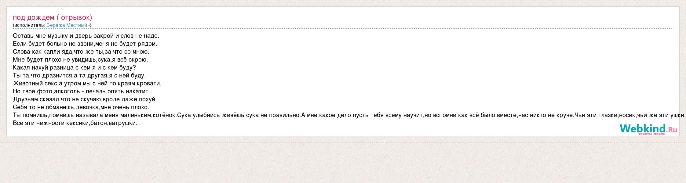Оставь мне музыку и дверь закрой и слов не надо. Если будет больно не звони,меня не будет рядом. Слова как капли яда,что же ты,за что со мною. Мне будет плохо не увидишь,сука,я всё скрою. Какая нахуй разница с кем я и с кем буду? Ты та,что дразнится,а та другая,я с ней буду. Животный секс,а утром мы с ней по краям кровати. Но твоё фото,алкоголь - печаль опять накатит. Друзьям сказал что не скучаю,вроде даже похуй. Себя то не обманешь,девочка,мне очень плохо. Ты помнишь,помнишь называла меня маленьким,котёнок.Сука улыбнись живёшь сука не правильно.А мне какое дело пусть тебя всему научит,но вспомни как всё было вместе,нас никто не круче.Чьи эти глазки,носик,чьи же эти ушки. Все эти нежности кексики,батон,ватрушки.