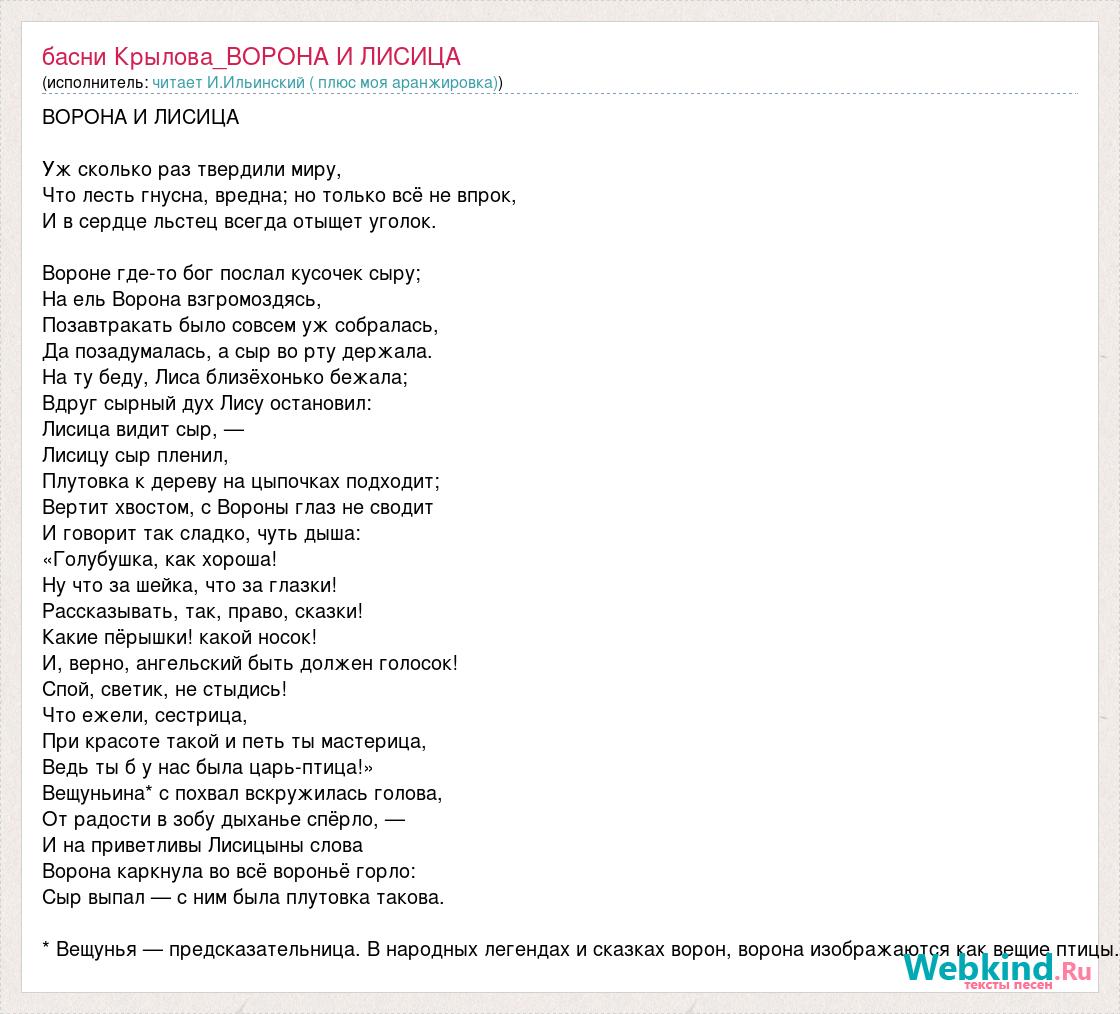 ВОРОНА И ЛИСИЦА Уж сколько раз твердили миру, Что лесть гнусна, вредна; но только всё не впрок, И в сердце льстец всегда отыщет уголок. Вороне где-то бог послал кусочек сыру; На ель Ворона взгромоздясь, Позавтракать было совсем уж собралась, Да позадумалась, а сыр во рту держала. На ту беду, Лиса близёхонько бежала; Вдруг сырный дух Лису остановил: Лисица видит сыр, — Лисицу сыр пленил, Плутовка к дереву на цыпочках подходит; Вертит хвостом, с Вороны глаз не сводит И говорит так сладко, чуть дыша: «Голубушка, как хороша! Ну что за шейка, что за глазки! Рассказывать, так, право, сказки! Какие пёрышки! какой носок! И, верно, ангельский быть должен голосок! Спой, светик, не стыдись! Что ежели, сестрица, При красоте такой и петь ты мастерица, Ведь ты б у нас была царь-птица!» Вещуньина* с похвал вскружилась голова, От радости в зобу дыханье спёрло, — И на приветливы Лисицыны слова Ворона каркнула во всё вороньё горло: Сыр выпал — с ним была плутовка такова. * Вещунья — предсказательница. В народных легендах и сказках ворон, ворона изображаются как вещие птицы.
