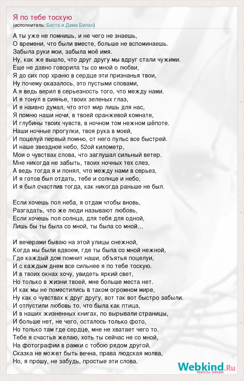 А ты уже не помнишь, и не чего не знаешь, О времени, что были вместе, больше не вспоминаешь. Забыла руки мои, забыла моё имя. Ну, как же вышло, что друг другу мы вдруг стали чужими. Еще не давно говорила ты со мной о любви, Я до сих пор храню в сердце эти признанья твои, Ну почему оказалось, это пустыми словами, А я ведь верил в серьезность того, что между нами. И я тонул в сиянье, твоих зеленых глаз, И я наивно думал, что этот мир лишь для нас, Я помню наши ночи, в твоей оранжевой комнате, И глубины твоих чувств, в ночном том нежном шёпоте. Наши ночные прогулки, твоя рука в моей, И поцелуй первый помню, от него пульс все быстрей. И наше звездное небо, 52ой километр, Мои о чувствах слова, что заглушал сильный ветер. Мне никогда не забыть, твоих ночных тех слез, А ведь тогда я и понял, что между нами в серьез, И я готов был отдать, тебе и солнце и небо, И я был счастлив тогда, как никогда раньше не был. Если хочешь пол неба, я отдам чтобы вновь, Разгадать, что же люди называют любовь, Если хочешь пол солнца, для тебя для одной, Лишь бы ты была со мной, ты была со мной… И вечерами бываю на этой улицы снежной, Когда мы были вдвоем, где ты была со мной нежной, Где каждый дом помнит наши, объятья поцелуи, И с каждым днем все сильнее я по тебе тоскую. И в твоих окнах хочу, увидеть яркий свет, Но только в жизни твоей, мне больше места нет. И как мы не поместились в таком огромном мире, Ну как о чувствах к друг другу, вот так вот быстро забыли. И отпустили любовь то, что была как птица, И в наших жизненных книгах, по вырывали страницы, И больше нет, не чего, осталось только фото, Но только там где сердце, мне не хватает чего то. Тебе я счастья желаю, хоть ты сейчас не со мной, На фотографии в рамки с тобою рядом другой, Сказка не может быть вечна, права людская молва, Но, я прошу, не забудь, простые эти слова.