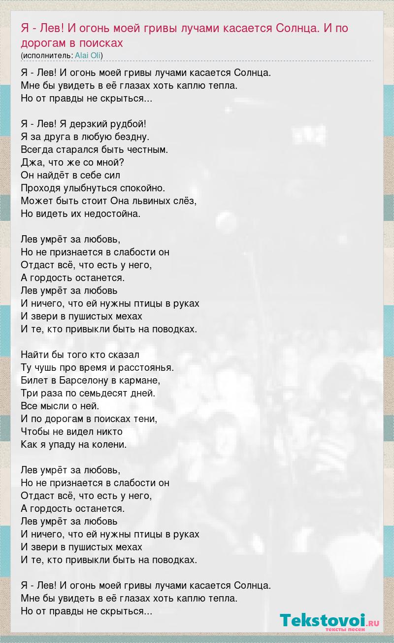 Я - Лев! И огонь моей гривы лучами касается Солнца. Мне бы увидеть в её глазах хоть каплю тепла. Но от правды не скрыться... Я - Лев! Я дерзкий рудбой! Я за друга в любую бездну. Всегда старался быть честным. Джа, что же со мной? Он найдёт в себе сил Проходя улыбнуться спокойно. Может быть стоит Она львиных слёз, Но видеть их недостойна. Лев умрёт за любовь, Но не признается в слабости он Отдаст всё, что есть у него, А гордость останется. Лев умрёт за любовь И ничего, что ей нужны птицы в руках И звери в пушистых мехах И те, кто привыкли быть на поводках. Найти бы того кто сказал Ту чушь про время и расстоянья. Билет в Барселону в кармане, Три раза по семьдесят дней. Все мысли о ней. И по дорогам в поисках тени, Чтобы не видел никто Как я упаду на колени. Лев умрёт за любовь, Но не признается в слабости он Отдаст всё, что есть у него, А гордость останется. Лев умрёт за любовь И ничего, что ей нужны птицы в руках И звери в пушистых мехах И те, кто привыкли быть на поводках. Я - Лев! И огонь моей гривы лучами касается Солнца. Мне бы увидеть в её глазах хоть каплю тепла. Но от правды не скрыться...