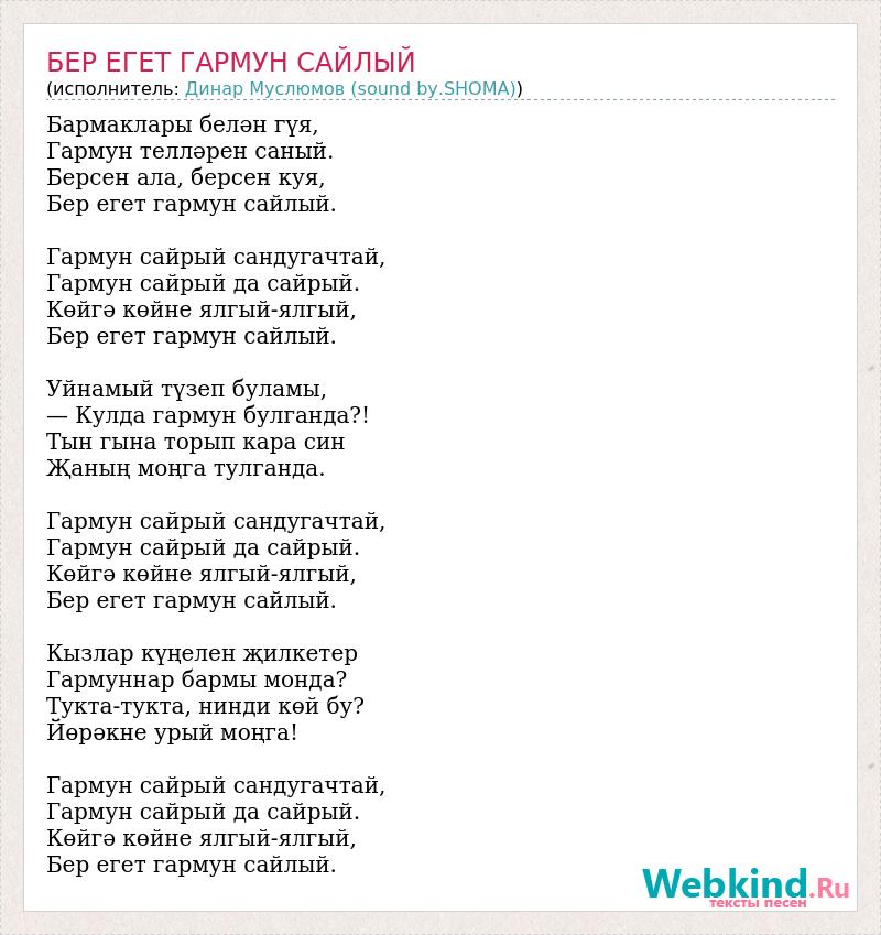 Бармаклары белән гүя, Гармун телләрен саный. Берсен ала, берсен куя, Бер егет гармун сайлый. Гармун сайрый сандугачтай, Гармун сайрый да сайрый. Көйгә көйне ялгый-ялгый, Бер егет гармун сайлый. Уйнамый түзеп буламы, — Кулда гармун булганда?! Тын гына торып кара син Җаның моңга тулганда. Гармун сайрый сандугачтай, Гармун сайрый да сайрый. Көйгә көйне ялгый-ялгый, Бер егет гармун сайлый. Кызлар күңелен җилкетер Гармуннар бармы монда? Тукта-тукта, нинди көй бу? Йөрәкне урый моңга! Гармун сайрый сандугачтай, Гармун сайрый да сайрый. Көйгә көйне ялгый-ялгый, Бер егет гармун сайлый.