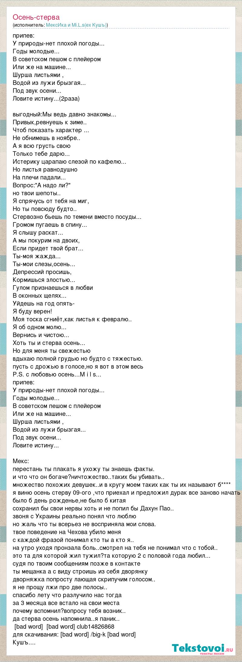 припев: У природы-нет плохой погоды... Годы молодые... В советском пешом с плейером Или же на машине... Шурша листьями , Водой из лужи брызгая... Под звук осени... Ловите истину...(2раза) выгодный:Мы ведь давно знакомы... Привык,ревнуешь к зиме.. Чтоб показать характер ... Не обнимешь в ноябре.. А я всю грусть свою Только тебе дарю... Истерику царапаю слезой по кафелю... Но листья равнодушно На плечи падали... Вопрос:"А надо ли?" но твои шепоты.. Я спрячусь от тебя на миг, Но ты повсюду будто.. Cтервозно бьешь по темени вместо посуды... Громом пугаешь в спину... Я слышу раскат... А мы покурим на двоих, Если придет твой брат... Ты-моя жажда... Ты-мои слезы,осень... Депрессий просишь, Кормишься злостью... Гулом признаешься в любви В оконных щелях... Уйдешь на год опять- Я буду верен! Моя тоска сгниёт,как листья к февралю.. Я об одном молю... Вернись и чистою... Хоть ты и стерва осень... Но для меня ты свежестью вдыхаю полной грудью но будто с тяжестью. пусть с дрожью в голосе,но я вот в этом весь P.S. с любовью осень...M i l s... припев: У природы-нет плохой погоды... Годы молодые... В советском пешом с плейером Или же на машине... Шурша листьями , Водой из лужи брызгая... Под звук осени... Ловите истину... Мекс: перестань ты плакать я ухожу ты знаешь факты. и что что он богаче?ничтожество..таких бы убивать.. множество похожих девушек..и в кругу моем таких как ты их называют б**** я виню осень стерву 09-ого ,что приехал и предложил дурак все заново начать было б день рожденье,не было б китая сохранил бы свои нервы хоть и не попил бы Дахун Пао.. звоня с Украины реально понял что люблю но жаль что ты всерьез не восприняла мои слова. твое поведение на Чехова убило меня с каждой фразой понимал кто ты а кто я.. на утро уходя пронзала боль..смотрел на тебя не понимал что с тобой.. это та для которой жил тужил?та которую 2 с половой года любил... судя по твоим сообщениям позже в контакте ты мещанка а с виду строишь из себя дворянку дворняжка попросту лающая скрипучим голосом.. я не прощу лжи про две полосы.. спасибо лету что разлучило нас тогда за 3 месяца все встало на свои места почему вспомнил?вопросу тебя возник.. да стерва осень напомнила..я паник.. [bad word] [bad word] club14826868 для скачивания: [bad word] /big-k [bad word] Кушъ....