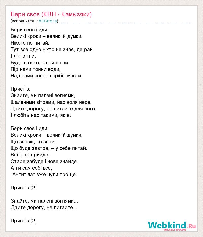 Бери своє і йди. Великі кроки – великі й думки. Нікого не питай, Тут все одно ніхто не знає, де рай. І лінію гни, Буде важко, та ти її гни. Під нами тонни води, Над нами сонце і срібні мости. Приспів: Знайте, ми палені вогнями, Шаленими вітрами, нас воля несе. Дайте дорогу, не питайте для чого, І любіть нас такими, як є. Бери своє і йди. Великі кроки – великі й думки. Що знаєш, то знай. Що буде завтра, – у себе питай. Воно-то прийде, Старе забуде і нове знайде. А ти сам собі все, "Антитіла" вже чули про це. Приспів (2) Знайте, ми палені вогнями... Дайте дорогу, не питайте... Приспів (2)