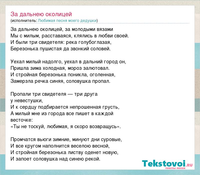 За дальнею околицей, за молодыми вязами Мы с милым, расставаяся, клялись в любви своей. И были три свидетеля: река голубоглазая, Березонька пушистая да звонкий соловей. Уехал милый надолго, уехал в дальний город он, Пришла зима холодная, мороз залютовал. И стройная березонька поникла, оголенная, Замерзла речка синяя, соловушка пропал. Пропали три свидетеля — три друга у невестушки, И к сердцу подбирается непрошенная грусть, А милый мне из города все пишет в каждой весточке: «Ты не тоскуй, любимая, я скоро возвращусь». Промчатся вьюги зимние, минуют дни суровые, И все кругом наполнится веселою весной, И стройная березонька листву оденет новую, И запоет соловушка над синею рекой.
