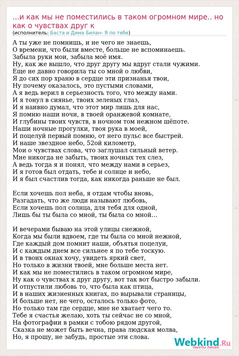 Главная→Исполнители→Баста и Дима Билан- Я по тебе→...и как мы не поместились в таком огромном мире.. но как о чувствах друг к