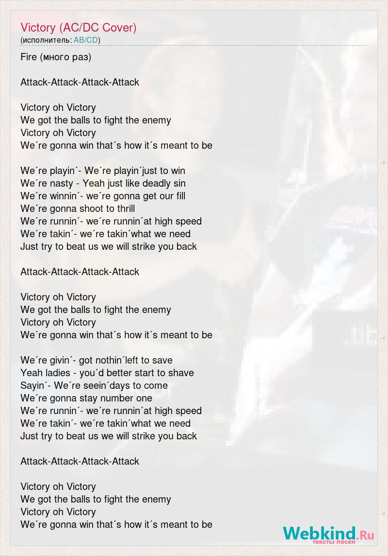 Fire (много раз) Attack-Attack-Attack-Attack Victory oh Victory We got the balls to fight the enemy Victory oh Victory We´re gonna win that´s how it´s meant to be We´re playin´- We´re playin´just to win We´re nasty - Yeah just like deadly sin We´re winnin´- we´re gonna get our fill We´re gonna shoot to thrill We´re runnin´- we´re runnin´at high speed We´re takin´- we´re takin´what we need Just try to beat us we will strike you back Attack-Attack-Attack-Attack Victory oh Victory We got the balls to fight the enemy Victory oh Victory We´re gonna win that´s how it´s meant to be We´re givin´- got nothin´left to save Yeah ladies - you´d better start to shave Sayin´- We´re seein´days to come We´re gonna stay number one We´re runnin´- we´re runnin´at high speed We´re takin´- we´re takin´what we need Just try to beat us we will strike you back Attack-Attack-Attack-Attack Victory oh Victory We got the balls to fight the enemy Victory oh Victory We´re gonna win that´s how it´s meant to be