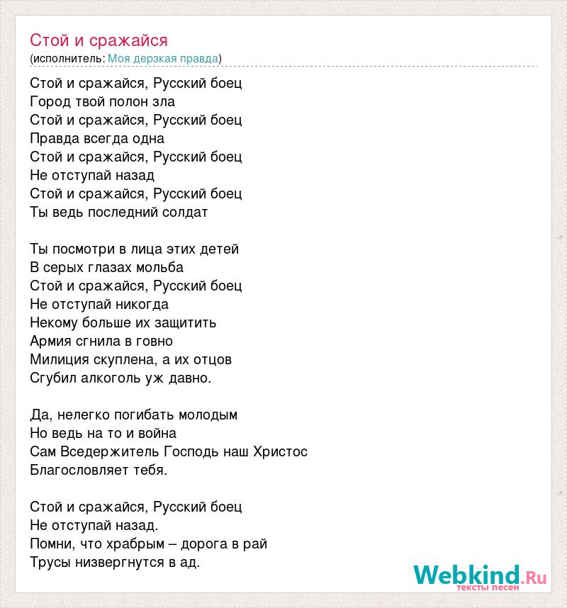 Стой и сражайся, Русский боец Город твой полон зла Стой и сражайся, Русский боец Правда всегда одна Стой и сражайся, Русский боец Не отступай назад Стой и сражайся, Русский боец Ты ведь последний солдат Ты посмотри в лица этих детей В серых глазах мольба Стой и сражайся, Русский боец Не отступай никогда Некому больше их защитить Армия сгнила в говно Милиция скуплена, а их отцов Сгубил алкоголь уж давно. Да, нелегко погибать молодым Но ведь на то и война Сам Вседержитель Господь наш Христос Благословляет тебя. Стой и сражайся, Русский боец Не отступай назад. Помни, что храбрым – дорога в рай Трусы низвергнутся в ад.