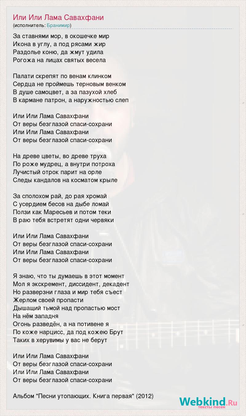 За ставнями мор, в окошечке мир Икона в углу, а под рясами жир Раздолье коню, да жмут удила Рогожа на лицах святых весела Палати скрепят по венам клинком Сердца не проймешь терновым венком В душе самоцвет, а за пазухой хлеб В кармане патрон, а наружностью слеп Или Или Лама Савахфани От веры безглазой спаси-сохрани Или Или Лама Савахфани От веры безглазой спаси-сохрани На древе цветы, во древе труха По роже мудрец, а внутри потроха Лучистый отрок парит на орле Следы кандалов на косматом крыле За сполохом рай, до рая хромай С усердием бесов на дыбе ломай Ползи как Маресьев и потом теки В раю тебя встретят одни червяки Или Или Лама Савахфани От веры безглазой спаси-сохрани Или Или Лама Савахфани От веры безглазой спаси-сохрани Я знаю, что ты думаешь в этот момент Мол я экскремент, диссидент, декадент Но разверзни глаза и мир тебя съест Жерлом своей пропасти Дышащий тьмой над пропастью мост На нём западня Огонь разведён, а на потивене я По коже нарцисс, да под кожею Брут Таких в херувимы у вас не берут Или Или Лама Савахфани От веры безглазой спаси-сохрани Или Или Лама Савахфани От веры безглазой спаси-сохрани Альбом "Песни утопающих. Книга первая" (2012)
