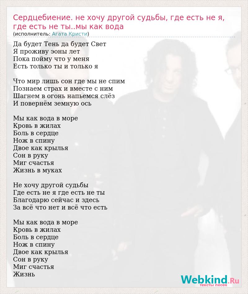 Главная→Исполнители→Агата Кристи→Сердцебиение. не хочу другой судьбы, где есть не я, где есть не ты..мы ка