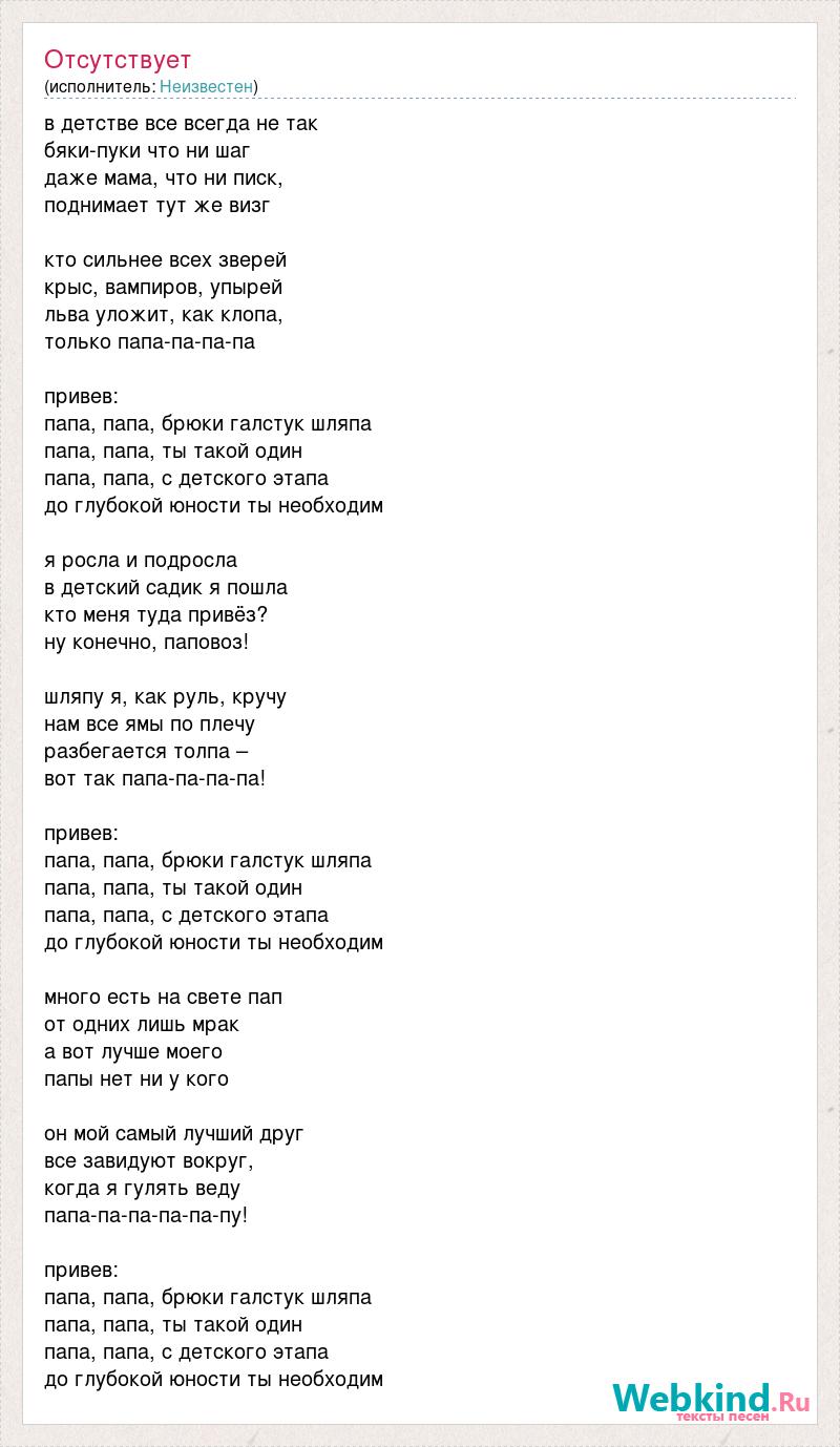 в детстве все всегда не так бяки-пуки что ни шаг даже мама, что ни писк, поднимает тут же визг кто сильнее всех зверей крыс, вампиров, упырей льва уложит, как клопа, только папа-па-па-па привев: папа, папа, брюки галстук шляпа папа, папа, ты такой один папа, папа, с детского этапа до глубокой юности ты необходим я росла и подросла в детский садик я пошла кто меня туда привёз? ну конечно, паповоз! шляпу я, как руль, кручу нам все ямы по плечу разбегается толпа – вот так папа-па-па-па! привев: папа, папа, брюки галстук шляпа папа, папа, ты такой один папа, папа, с детского этапа до глубокой юности ты необходим много есть на свете пап от одних лишь мрак а вот лучше моего папы нет ни у кого он мой самый лучший друг все завидуют вокруг, когда я гулять веду папа-па-па-па-па-пу! привев: папа, папа, брюки галстук шляпа папа, папа, ты такой один папа, папа, с детского этапа до глубокой юности ты необходим