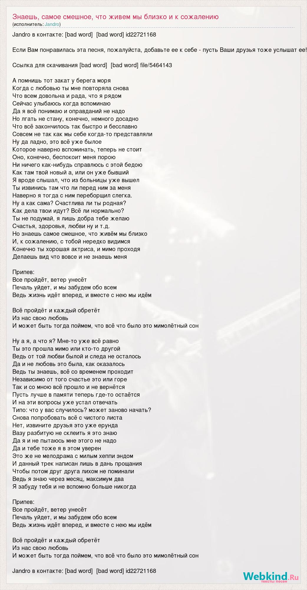 Jandro в контакте: [bad word] [bad word] id22721168 Если Вам понравилась эта песня, пожалуйста, добавьте ее к себе - пусть Ваши друзья тоже услышат ее! Ссылка для скачивания [bad word] [bad word] file/5464143 А помнишь тот закат у берега моря Когда с любовью ты мне повторяла снова Что всем довольна и рада, что я рядом Сейчас улыбаюсь когда вспоминаю Да я всё понимаю и оправданий не надо Но лгать не стану, конечно, немного досадно Что всё закончилось так быстро и бесславно Совсем не так как мы себе когда-то представляли Ну да ладно, это всё уже былое Которое наверно вспоминать, теперь не стоит Оно, конечно, беспокоит меня порою Ни ничего как-нибудь справлюсь с этой бедою Как там твой новый а, или он уже бывший Я вроде слышал, что из больницы уже вышел Ты извинись там что ли перед ним за меня Наверно я тогда с ним переборщил слегка. Ну а как сама? Счастлива ли ты родная? Как дела твои идут? Всё ли нормально? Ты не подумай, я лишь добра тебе желаю Счастья, здоровья, любви ну и т.д. Но знаешь самое смешное, что живём мы близко И, к сожалению, с тобой нередко видимся Конечно ты хорошая актриса, и мимо проходя Делаешь вид что вовсе и не знаешь меня Припев: Все пройдёт, ветер унесёт Печаль уйдет, и мы забудем обо всем Ведь жизнь идёт вперед, и вместе с нею мы идём Всё пройдёт и каждый обретёт Из нас свою любовь И может быть тогда поймем, что всё что было это мимолётный сон Ну а я, а что я? Мне-то уже всё равно Ты это прошла мимо или кто-то другой Ведь от той любви былой и следа не осталось Да и не любовь это была, как оказалось Ведь ты знаешь, всё со временем проходит Независимо от того счастье это или горе Так и со мною всё прошло и не вернётся Пусть лучше в памяти теперь где-то остаётся И на эти вопросы уже устал отвечать Типо: что у вас случилось? может заново начать? Снова попробовать всё с чистого листа Нет, извините друзья это уже ерунда Вазу разбитую не склеить я это знаю Да я и не пытаюсь мне этого не надо Да и тебе тоже я в этом уверен Это же не мелодрама с милым хеппи эндом И данный трек написан лишь в дань прощания Чтобы потом друг друга лихом не поминали Ведь я знаю через месяц, максимум два Я забуду тебя и не вспомню больше никогда Припев: Все пройдёт, ветер унесёт Печаль уйдет, и мы забудем обо всем Ведь жизнь идёт вперед, и вместе с нею мы идём Всё пройдёт и каждый обретёт Из нас свою любовь И может быть тогда поймем, что всё что было это мимолётный сон Jandro в контакте: [bad word] [bad word] id22721168
