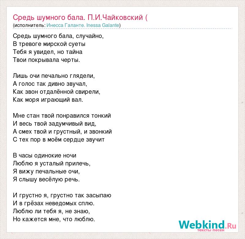 Средь шумного бала, случайно, В тревоге мирской суеты Тебя я увидел, но тайна Твои покрывала черты. Лишь очи печально глядели, А голос так дивно звучал, Как звон отдалённой свирели, Как моря играющий вал. Мне стан твой понравился тонкий И весь твой задумчивый вид, А смех твой и грустный, и звонкий С тех пор в моём сердце звучит В часы одинокие ночи Люблю я усталый прилечь, Я вижу печальные очи, Я слышу весёлую речь. И грустно я, грустно так засыпаю И в грёзах неведомых сплю. Люблю ли тебя я, не знаю, Но кажется мне, что люблю.