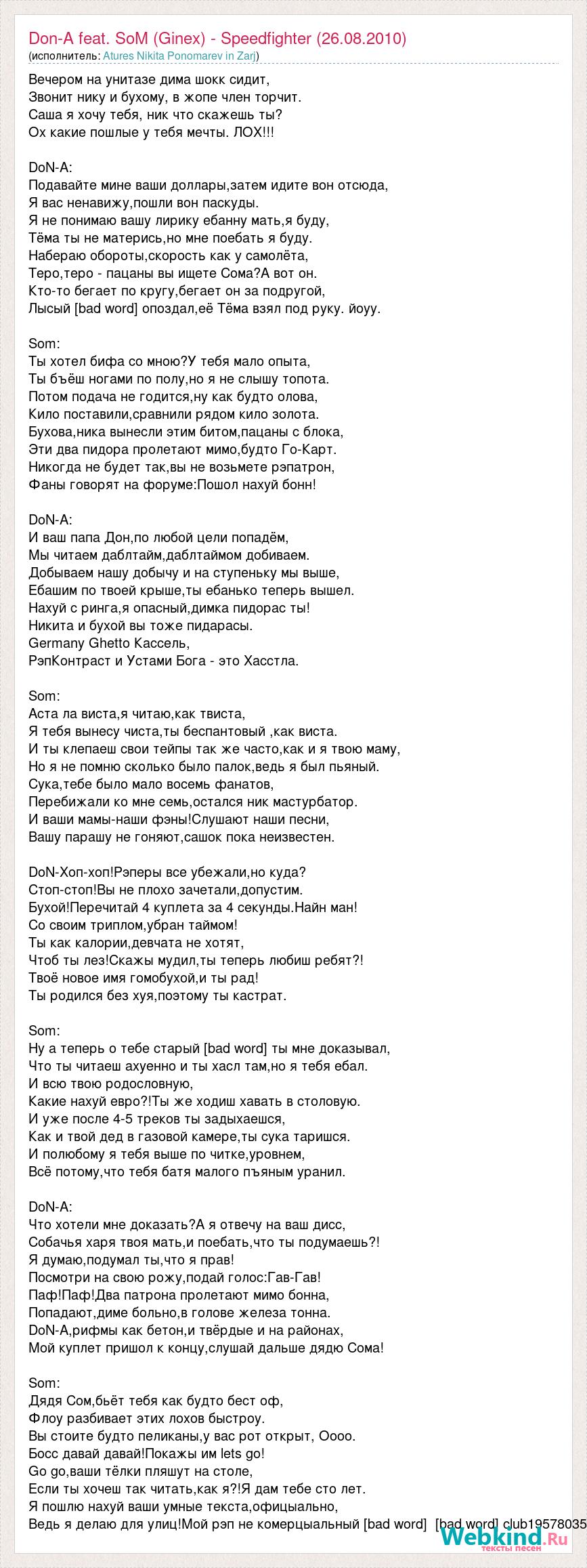 Вечером на унитазе дима шокк сидит, Звонит нику и бухому, в жопе член торчит. Саша я хочу тебя, ник что скажешь ты? Ох какие пошлые у тебя мечты. ЛОХ!!! DoN-A: Подавайте мине ваши доллары,затем идите вон отсюда, Я вас ненавижу,пошли вон паскуды. Я не понимаю вашу лирику ебанну мать,я буду, Тёма ты не матерись,но мне поебать я буду. Набераю обороты,скорость как у самолёта, Теро,теро - пацаны вы ищете Сома?А вот он. Кто-то бегает по кругу,бегает он за подругой, Лысый [bad word] опоздал,её Тёма взял под руку. йоуу. Som: Ты хотел бифа со мною?У тебя мало опыта, Ты бъёш ногами по полу,но я не слышу топота. Потом подача не годится,ну как будто олова, Кило поставили,сравнили рядом кило золота. Бухова,ника вынесли этим битом,пацаны с блока, Эти два пидора пролетают мимо,будто Го-Карт. Никогда не будет так,вы не возьмете рэпатрон, Фаны говорят на форуме:Пошол нахуй бонн! DoN-A: И ваш папа Дон,по любой цели попадём, Мы читаем даблтайм,даблтаймом добиваем. Добываем нашу добычу и на ступеньку мы выше, Ебашим по твоей крыше,ты ебанько теперь вышел. Нахуй с ринга,я опасный,димка пидорас ты! Никита и бухой вы тоже пидарасы. Germany Ghetto Кассель, РэпКонтраст и Устами Бога - это Хасстла. Som: Аста ла виста,я читаю,как твиста, Я тебя вынесу чиста,ты беспантовый ,как виста. И ты клепаеш свои тейпы так же часто,как и я твою маму, Но я не помню сколько было палок,ведь я был пьяный. Сука,тебе было мало восемь фанатов, Перебижали ко мне семь,остался ник мастурбатор. И ваши мамы-наши фэны!Слушают наши песни, Вашу парашу не гоняют,сашок пока неизвестен. DoN-Хоп-хоп!Рэперы все убежали,но куда? Стоп-стоп!Вы не плохо зачетали,допустим. Бухой!Перечитай 4 куплета за 4 секунды.Найн ман! Со своим триплом,убран таймом! Ты как калории,девчата не хотят, Чтоб ты лез!Скажы мудил,ты теперь любиш ребят?! Твоё новое имя гомобухой,и ты рад! Ты родился без хуя,поэтому ты кастрат. Som: Ну а теперь о тебе старый [bad word] ты мне доказывал, Что ты читаеш ахуенно и ты хасл там,но я тебя ебал. И всю твою родословную, Какие нахуй евро?!Ты же ходиш хавать в столовую. И уже после 4-5 треков ты задыхаешся, Как и твой дед в газовой камере,ты сука таришся. И полюбому я тебя выше по читке,уровнем, Всё потому,что тебя батя малого пъяным уранил. DoN-A: Что хотели мне доказать?А я отвечу на ваш дисс, Собачья харя твоя мать,и поебать,что ты подумаешь?! Я думаю,подумал ты,что я прав! Посмотри на свою рожу,подай голос:Гав-Гав! Паф!Паф!Два патрона пролетают мимо бонна, Попадают,диме больно,в голове железа тонна. DoN-A,рифмы как бетон,и твёрдые и на районах, Мой куплет пришол к концу,слушай дальше дядю Сома! Som: Дядя Сом,бьёт тебя как будто бест оф, Флоу разбивает этих лохов быстроу. Вы стоите будто пеликаны,у вас рот открыт, Оооо. Босс давай давай!Покажы им lets go! Go go,ваши тёлки пляшут на столе, Если ты хочеш так читать,как я?!Я дам тебе сто лет. Я пошлю нахуй ваши умные текста,офицыально, Ведь я делаю для улиц!Мой рэп не комерцыальный [bad word] [bad word] club19578035