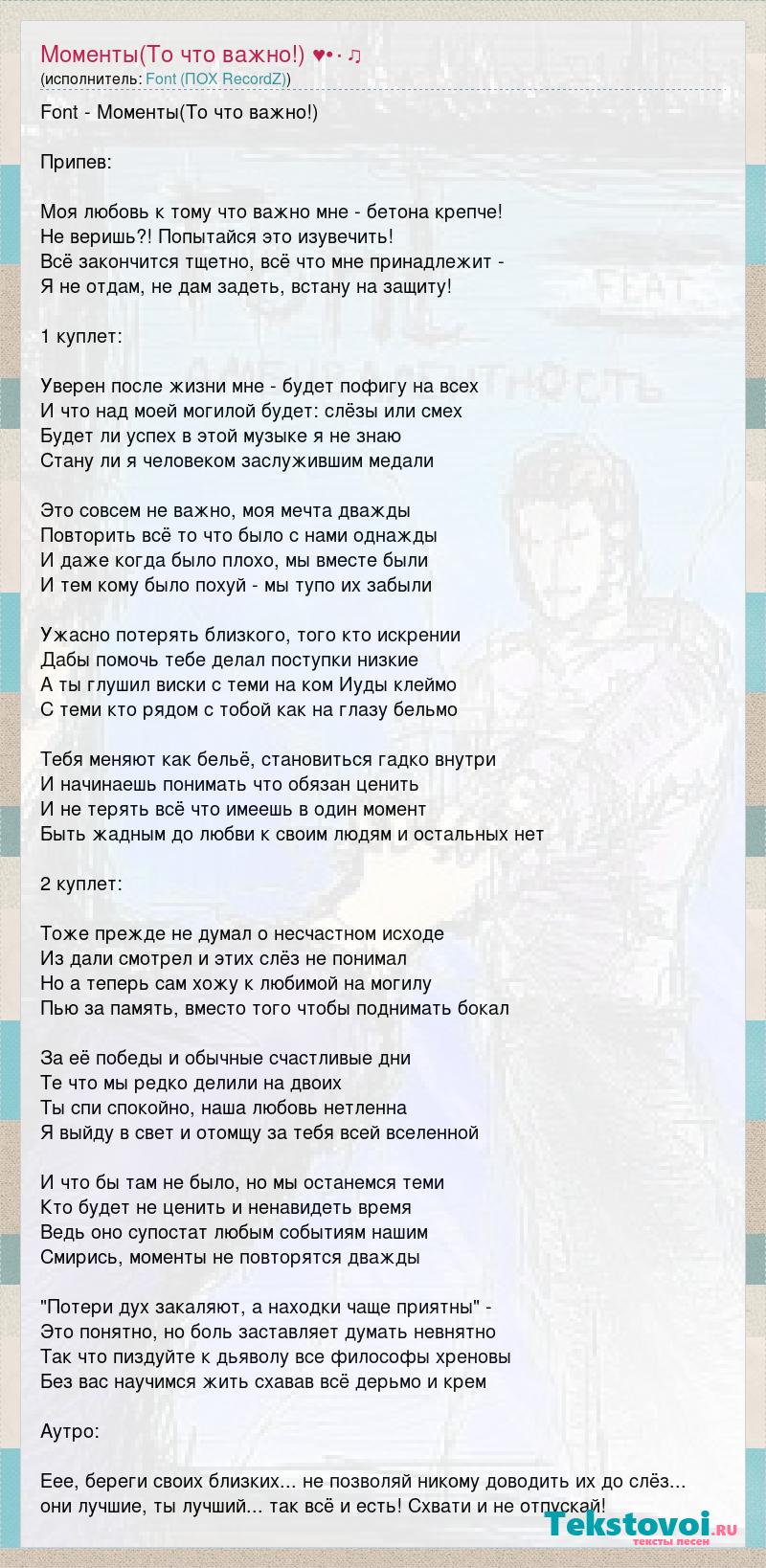 Font - Моменты(То что важно!) Припев: Моя любовь к тому что важно мне - бетона крепче! Не веришь?! Попытайся это изувечить! Всё закончится тщетно, всё что мне принадлежит - Я не отдам, не дам задеть, встану на защиту! 1 куплет: Уверен после жизни мне - будет пофигу на всех И что над моей могилой будет: слёзы или смех Будет ли успех в этой музыке я не знаю Стану ли я человеком заслужившим медали Это совсем не важно, моя мечта дважды Повторить всё то что было с нами однажды И даже когда было плохо, мы вместе были И тем кому было похуй - мы тупо их забыли Ужасно потерять близкого, того кто искрении Дабы помочь тебе делал поступки низкие А ты глушил виски с теми на ком Иуды клеймо С теми кто рядом с тобой как на глазу бельмо Тебя меняют как бельё, становиться гадко внутри И начинаешь понимать что обязан ценить И не терять всё что имеешь в один момент Быть жадным до любви к своим людям и остальных нет 2 куплет: Тоже прежде не думал о несчастном исходе Из дали смотрел и этих слёз не понимал Но а теперь сам хожу к любимой на могилу Пью за память, вместо того чтобы поднимать бокал За её победы и обычные счастливые дни Те что мы редко делили на двоих Ты спи спокойно, наша любовь нетленна Я выйду в свет и отомщу за тебя всей вселенной И что бы там не было, но мы останемся теми Кто будет не ценить и ненавидеть время Ведь оно супостат любым событиям нашим Смирись, моменты не повторятся дважды "Потери дух закаляют, а находки чаще приятны" - Это понятно, но боль заставляет думать невнятно Так что пиздуйте к дьяволу все философы хреновы Без вас научимся жить схавав всё дерьмо и крем Аутро: Еее, береги своих близких... не позволяй никому доводить их до слёз... они лучшие, ты лучший... так всё и есть! Схвати и не отпускай!