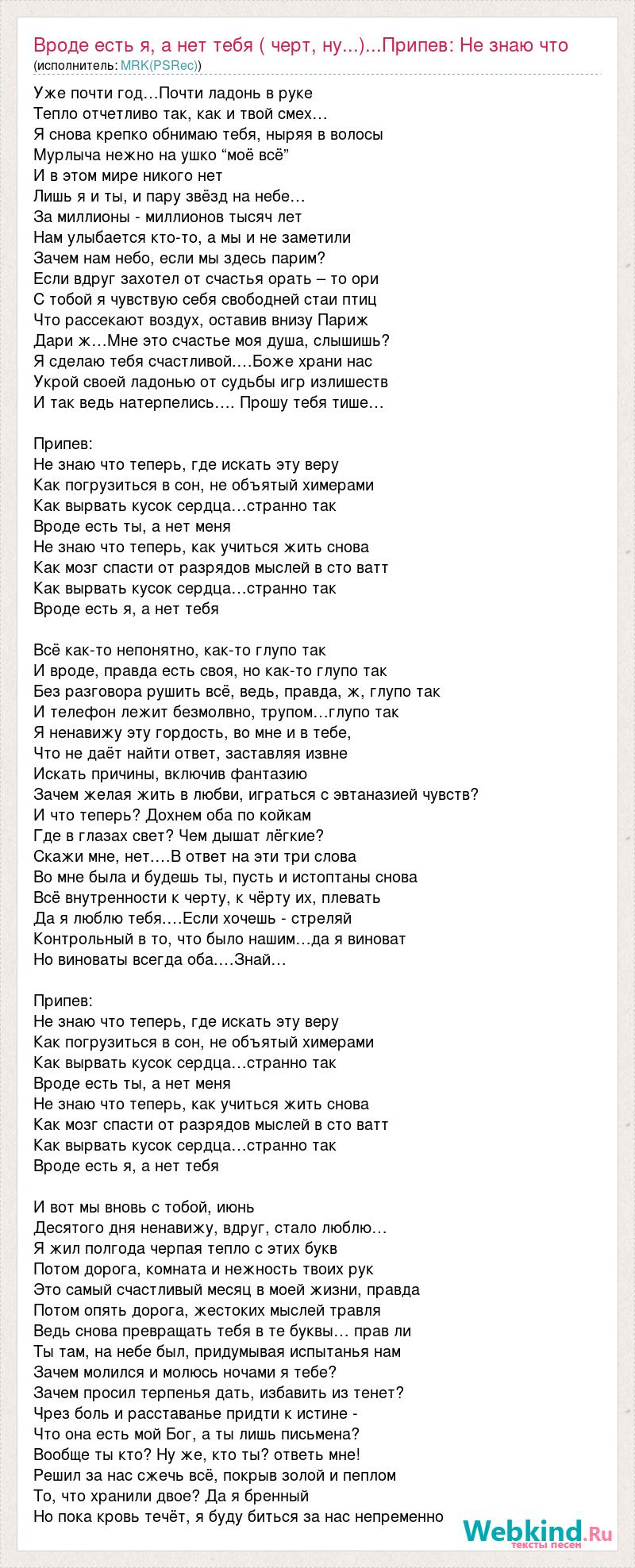 Уже почти год…Почти ладонь в руке Тепло отчетливо так, как и твой смех… Я снова крепко обнимаю тебя, ныряя в волосы Мурлыча нежно на ушко “моё всё” И в этом мире никого нет Лишь я и ты, и пару звёзд на небе… За миллионы - миллионов тысяч лет Нам улыбается кто-то, а мы и не заметили Зачем нам небо, если мы здесь парим? Если вдруг захотел от счастья орать – то ори С тобой я чувствую себя свободней стаи птиц Что рассекают воздух, оставив внизу Париж Дари ж…Мне это счастье моя душа, слышишь? Я сделаю тебя счастливой.…Боже храни нас Укрой своей ладонью от судьбы игр излишеств И так ведь натерпелись…. Прошу тебя тише… Припев: Не знаю что теперь, где искать эту веру Как погрузиться в сон, не объятый химерами Как вырвать кусок сердца…странно так Вроде есть ты, а нет меня Не знаю что теперь, как учиться жить снова Как мозг спасти от разрядов мыслей в сто ватт Как вырвать кусок сердца…странно так Вроде есть я, а нет тебя Всё как-то непонятно, как-то глупо так И вроде, правда есть своя, но как-то глупо так Без разговора рушить всё, ведь, правда, ж, глупо так И телефон лежит безмолвно, трупом…глупо так Я ненавижу эту гордость, во мне и в тебе, Что не даёт найти ответ, заставляя извне Искать причины, включив фантазию Зачем желая жить в любви, играться с эвтаназией чувств? И что теперь? Дохнем оба по койкам Где в глазах свет? Чем дышат лёгкие? Скажи мне, нет.…В ответ на эти три слова Во мне была и будешь ты, пусть и истоптаны снова Всё внутренности к черту, к чёрту их, плевать Да я люблю тебя.…Если хочешь - стреляй Контрольный в то, что было нашим…да я виноват Но виноваты всегда оба.…Знай… Припев: Не знаю что теперь, где искать эту веру Как погрузиться в сон, не объятый химерами Как вырвать кусок сердца…странно так Вроде есть ты, а нет меня Не знаю что теперь, как учиться жить снова Как мозг спасти от разрядов мыслей в сто ватт Как вырвать кусок сердца…странно так Вроде есть я, а нет тебя И вот мы вновь с тобой, июнь Десятого дня ненавижу, вдруг, стало люблю… Я жил полгода черпая тепло с этих букв Потом дорога, комната и нежность твоих рук Это самый счастливый месяц в моей жизни, правда Потом опять дорога, жестоких мыслей травля Ведь снова превращать тебя в те буквы… прав ли Ты там, на небе был, придумывая испытанья нам Зачем молился и молюсь ночами я тебе? Зачем просил терпенья дать, избавить из тенет? Чрез боль и расставанье придти к истине - Что она есть мой Бог, а ты лишь письмена? Вообще ты кто? Ну же, кто ты? ответь мне! Решил за нас сжечь всё, покрыв золой и пеплом То, что хранили двое? Да я бренный Но пока кровь течёт, я буду биться за нас непременно