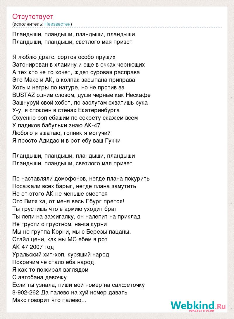 Пландыши, пландыши, пландыши, пландыши Пландыши, пландыши, светлого мая привет Я люблю драгс, сортов особо прущих Затонирован в хламину и еще в очках чернющих А тех кто че то хочет, ждет суровая расправа Это Макс и АК, в колпак засыпана приправа Хоть и негры по натуре, но не против ээ BUSTAZ одним словом, души черные как Нескафе Зашнуруй свой хобот, по заслугам схватишь сука У-у, я спокоен в стенах Екатеринбурга Охуенно рэп ебашим по секрету скажем всем У падиков бабульки знаю АК-47 Любого я вшатаю, гопник я могучий Я просто Адидас и в рот ебу ваш Гуччи Пландыши, пландыши, пландыши, пландыши Пландыши, пландыши, светлого мая привет По наставляли домофонов, негде плана покурить Посажали всех барыг, негде плана замутить Но от этого АК не меньше смеется Это Витя ха, от меня весь Ебург прется! Ты грустишь что в армию уходит брат Ты лепи на зажигалку, он налепит на приклад Не грусти о грустном, на-ка курни Мы не группа Корни, мы с Березы пацаны. Стайл цени, как мы МС ебем в рот АК 47 2007 год Уральский хип-хоп, курящий народ Покричим че стало еба народ Я как то пожирал взглядом С автобана девочку Если ты узнала, пиши мой номер на салфеточку 8-902-262 Да палево на хуй номер давать Макс говорит что палево...