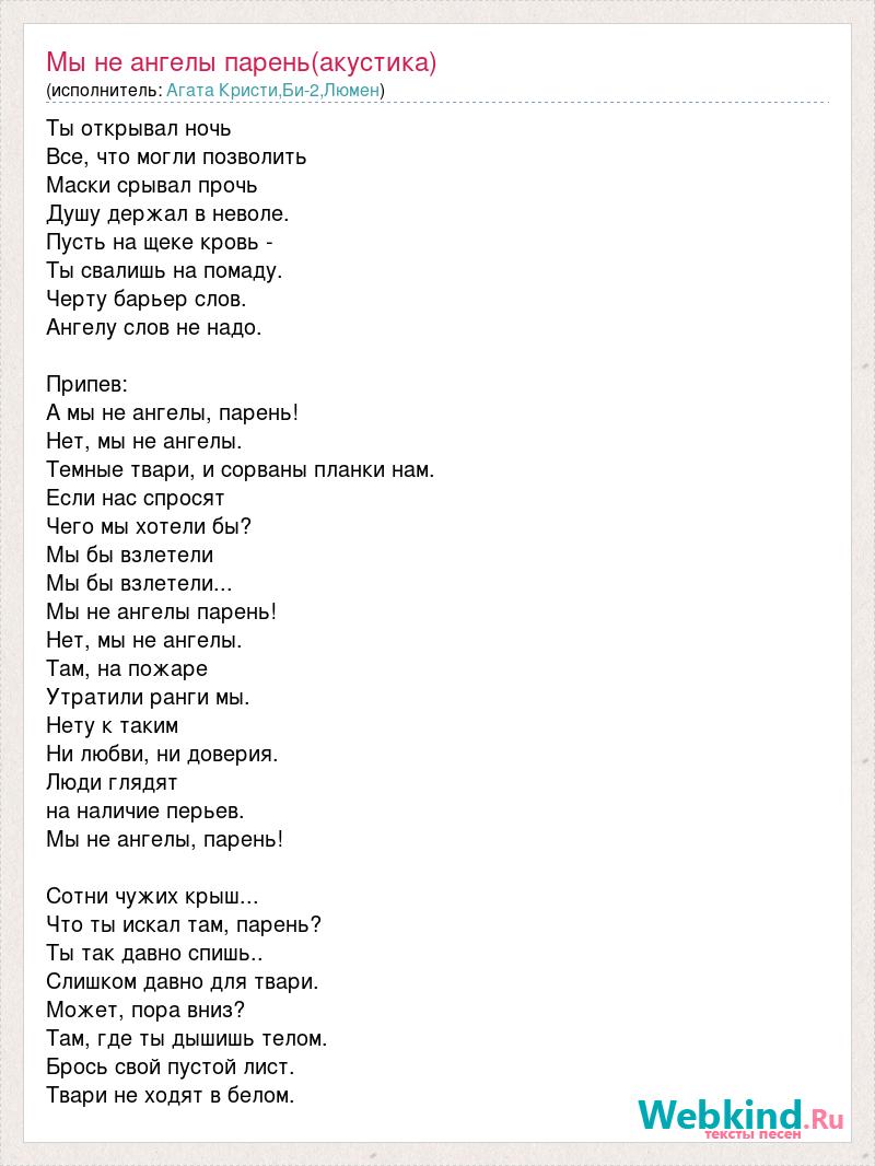Ты открывал ночь Все, что могли позволить Маски срывал прочь Душу держал в неволе. Пусть на щеке кровь - Ты свалишь на помаду. Черту барьер слов. Ангелу слов не надо. Припев: А мы не ангелы, парень! Нет, мы не ангелы. Темные твари, и сорваны планки нам. Если нас спросят Чего мы хотели бы? Мы бы взлетели Мы бы взлетели... Мы не ангелы парень! Нет, мы не ангелы. Там, на пожаре Утратили ранги мы. Нету к таким Ни любви, ни доверия. Люди глядят на наличие перьев. Мы не ангелы, парень! Сотни чужих крыш... Что ты искал там, парень? Ты так давно спишь.. Слишком давно для твари. Может, пора вниз? Там, где ты дышишь телом. Брось свой пустой лист. Твари не ходят в белом.