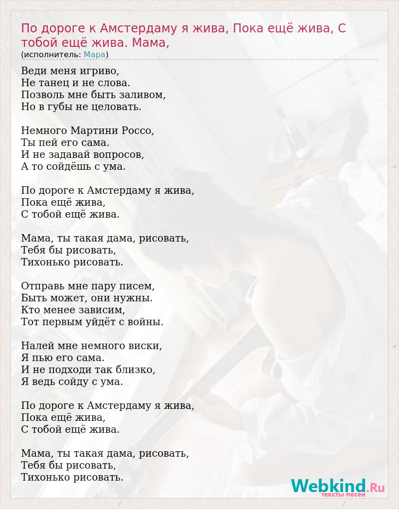 Веди меня игриво, Не танец и не слова. Позволь мне быть заливом, Но в губы не целовать. Немного Мартини Россо, Ты пей его сама. И не задавай вопросов, А то сойдёшь с ума. По дороге к Амстердаму я жива, Пока ещё жива, С тобой ещё жива. Мама, ты такая дама, рисовать, Тебя бы рисовать, Тихонько рисовать. Отправь мне пару писем, Быть может, они нужны. Кто менее зависим, Тот первым уйдёт с войны. Налей мне немного виски, Я пью его сама. И не подходи так близко, Я ведь сойду с ума. По дороге к Амстердаму я жива, Пока ещё жива, С тобой ещё жива. Мама, ты такая дама, рисовать, Тебя бы рисовать, Тихонько рисовать.