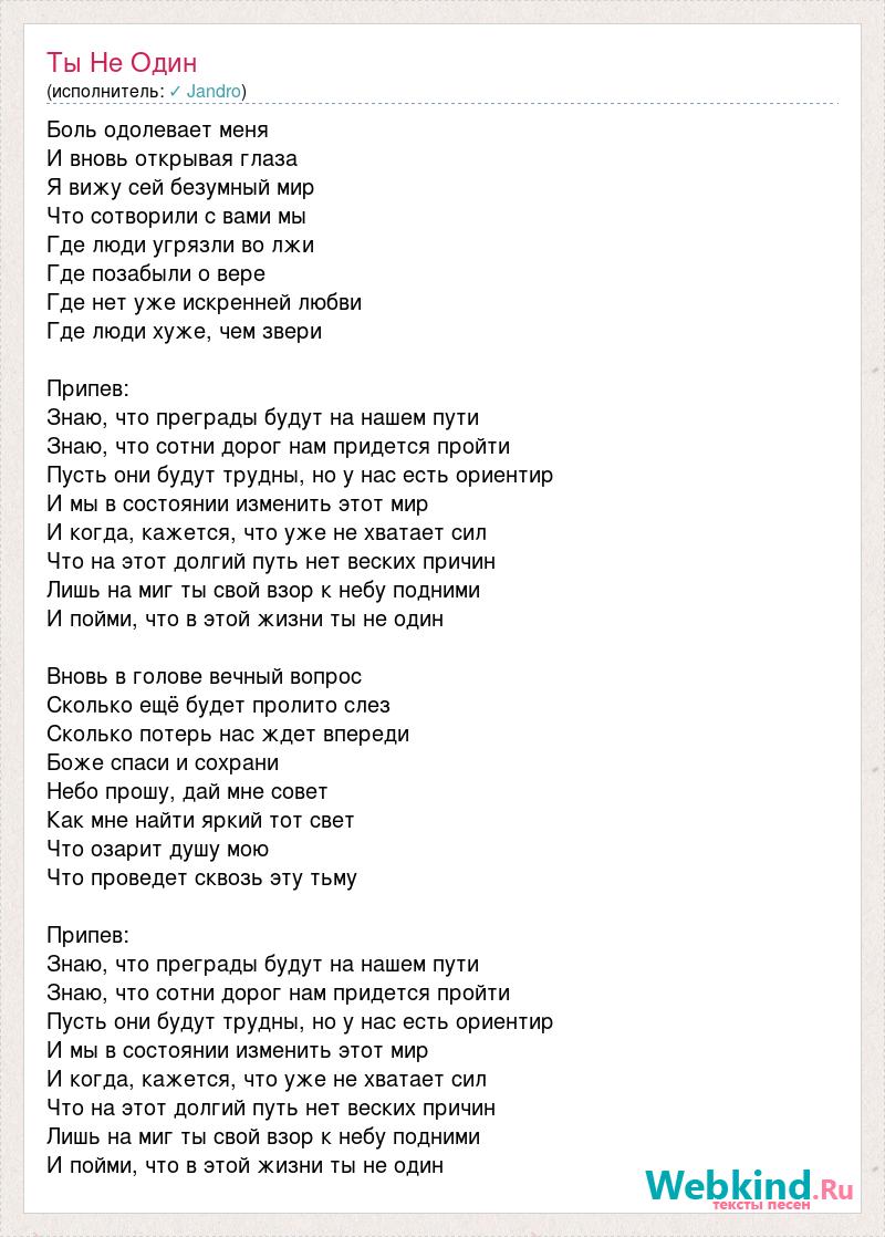 Боль одолевает меня И вновь открывая глаза Я вижу сей безумный мир Что сотворили с вами мы Где люди угрязли во лжи Где позабыли о вере Где нет уже искренней любви Где люди хуже, чем звери Припев: Знаю, что преграды будут на нашем пути Знаю, что сотни дорог нам придется пройти Пусть они будут трудны, но у нас есть ориентир И мы в состоянии изменить этот мир И когда, кажется, что уже не хватает сил Что на этот долгий путь нет веских причин Лишь на миг ты свой взор к небу подними И пойми, что в этой жизни ты не один Вновь в голове вечный вопрос Сколько ещё будет пролито слез Сколько потерь нас ждет впереди Боже спаси и сохрани Небо прошу, дай мне совет Как мне найти яркий тот свет Что озарит душу мою Что проведет сквозь эту тьму Припев: Знаю, что преграды будут на нашем пути Знаю, что сотни дорог нам придется пройти Пусть они будут трудны, но у нас есть ориентир И мы в состоянии изменить этот мир И когда, кажется, что уже не хватает сил Что на этот долгий путь нет веских причин Лишь на миг ты свой взор к небу подними И пойми, что в этой жизни ты не один
