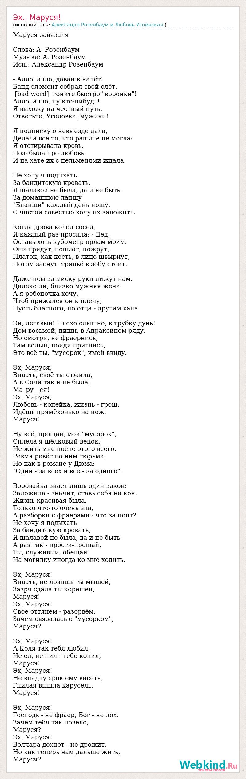 Маруся завязаля Слова: А. Розенбаум Музыка: А. Розенбаум Исп.: Александр Розенбаум - Алло, алло, давай в налёт! Банд-элемент собрал свой слёт. [bad word] гоните быстро "воронки"! Алло, алло, ну кто-нибудь! Я выхожу на честный путь. Ответьте, Уголовка, мужики! Я подписку о невыезде дала, Делала всё то, что раньше не могла: Я отстирывала кровь, Позабыла про любовь И на хате их с пельменями ждала. Не хочу я подыхать За бандитскую кровать, Я шалавой не была, да и не быть. За домашнюю лапшу "Бланши" каждый день ношу. С чистой совестью хочу их заложить. Когда дрова колол сосед, Я каждый раз просила: - Дед, Оставь хоть кубометр орлам моим. Они придут, попьют, пожрут, Платок, как кость, в лицо швырнут, Потом заснут, тряпьё в зобу стоит. Даже псы за миску руки лижут нам. Далеко ли, близко мужняя жена. А я ребёночка хочу, Чтоб прижался он к плечу, Пусть блатного, но отца - другим хана. Эй, легавый! Плохо слышно, в трубку дунь! Дом восьмой, пиши, в Апраксином ряду. Но смотри, не фраернись, Там волын, пойди пригнись, Это всё ты, "мусорок", имей ввиду. Эх, Маруся, Видать, своё ты отжила, А в Сочи так и не была, Ма_ру__ся! Эх, Маруся, Любовь - копейка, жизнь - грош. Идёшь прямёхонько на нож, Маруся! Ну всё, прощай, мой "мусорок", Сплела я шёлковый венок, Не жить мне после этого всего. Ревмя ревёт по ним тюрьма, Но как в романе у Дюма: "Один - за всех и все - за одного". Воровайка знает лишь один закон: Заложила - значит, ставь себя на кон. Жизнь красивая была, Только что-то очень зла, А разборки с фраерами - что за понт? Не хочу я подыхать За бандитскую кровать, Я шалавой не была, да и не быть. А раз так - прости-прощай, Ты, служивый, обещай На могилку иногда ко мне ходить. Эх, Маруся! Видать, не ловишь ты мышей, Зазря сдала ты корешей, Маруся! Эх, Маруся! Своё оттянем - разорвём. Зачем связалась с "мусорком", Маруся? Эх, Маруся! А Коля так тебя любил, Не ел, не пил - тебе копил, Маруся! Эх, Маруся! Не впадлу срок ему висеть, Гнилая вышла карусель, Маруся! Эх, Маруся! Господь - не фраер, Бог - не лох. Зачем тебя так повело, Маруся? Эх, Маруся! Волчара дохнет - не дрожит. Но как теперь нам дальше жить, Маруся?