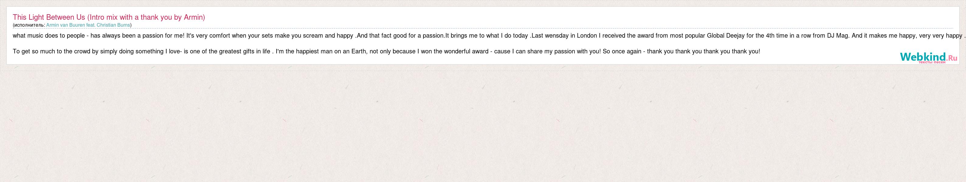 Главная→Исполнители→Armin van Buuren feat. Christian Burns→This Light Between Us (Intro mix with a thank you by Armin)