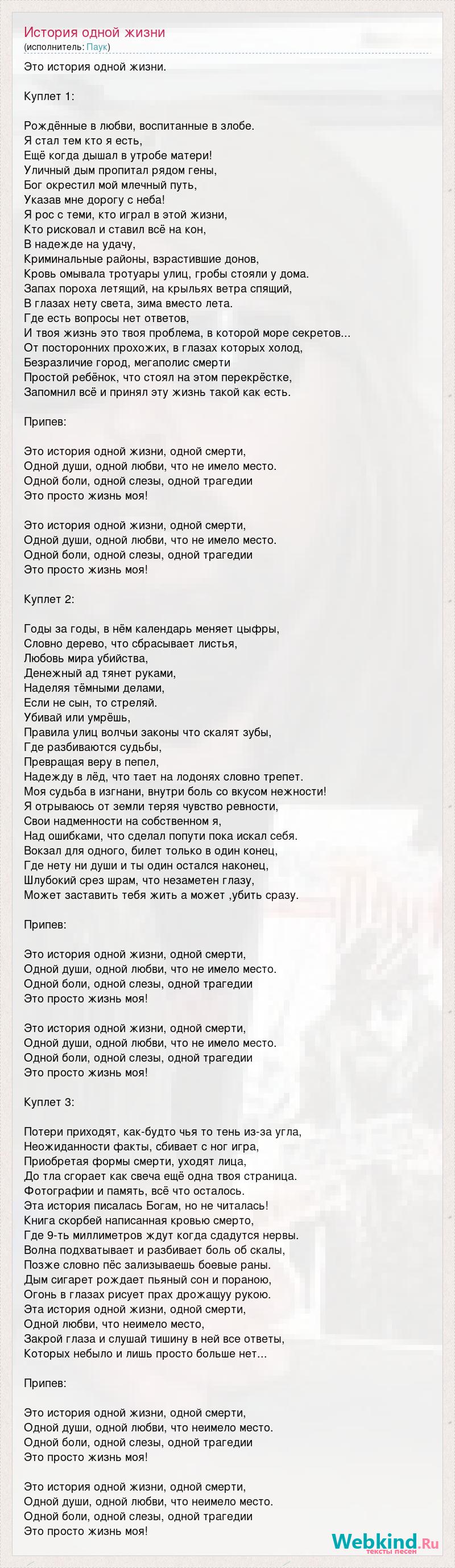 Это история одной жизни. Куплет 1: Рождённые в любви, воспитанные в злобе. Я стал тем кто я есть, Ещё когда дышал в утробе матери! Уличный дым пропитал рядом гены, Бог окрестил мой млечный путь, Указав мне дорогу с неба! Я рос с теми, кто играл в этой жизни, Кто рисковал и ставил всё на кон, В надежде на удачу, Криминальные районы, взрастившие донов, Кровь омывала тротуары улиц, гробы стояли у дома. Запах пороха летящий, на крыльях ветра спящий, В глазах нету света, зима вместо лета. Где есть вопросы нет ответов, И твоя жизнь это твоя проблема, в которой море секретов... От посторонних прохожих, в глазах которых холод, Безразличие город, мегаполис смерти Простой ребёнок, что стоял на этом перекрёстке, Запомнил всё и принял эту жизнь такой как есть. Припев: Это история одной жизни, одной смерти, Одной души, одной любви, что не имело место. Одной боли, одной слезы, одной трагедии Это просто жизнь моя! Это история одной жизни, одной смерти, Одной души, одной любви, что не имело место. Одной боли, одной слезы, одной трагедии Это просто жизнь моя! Куплет 2: Годы за годы, в нём календарь меняет цыфры, Словно дерево, что сбрасывает листья, Любовь мира убийства, Денежный ад тянет руками, Наделяя тёмными делами, Если не сын, то стреляй. Убивай или умрёшь, Правила улиц волчьи законы что скалят зубы, Где разбиваются судьбы, Превращая веру в пепел, Надежду в лёд, что тает на лодонях словно трепет. Моя судьба в изгнани, внутри боль со вкусом нежности! Я отрываюсь от земли теряя чувство ревности, Свои надменности на собственном я, Над ошибками, что сделал попути пока искал себя. Вокзал для одного, билет только в один конец, Где нету ни души и ты один остался наконец, Шлубокий срез шрам, что незаметен глазу, Может заставить тебя жить а может ,убить сразу. Припев: Это история одной жизни, одной смерти, Одной души, одной любви, что не имело место. Одной боли, одной слезы, одной трагедии Это просто жизнь моя! Это история одной жизни, одной смерти, Одной души, одной любви, что не имело место. Одной боли, одной слезы, одной трагедии Это просто жизнь моя! Куплет 3: Потери приходят, как-будто чья то тень из-за угла, Неожиданности факты, сбивает с ног игра, Приобретая формы смерти, уходят лица, До тла сгорает как свеча ещё одна твоя страница. Фотографии и память, всё что осталось. Эта история писалась Богам, но не читалась! Книга скорбей написанная кровью смерто, Где 9-ть миллиметров ждут когда сдадутся нервы. Волна подхватывает и разбивает боль об скалы, Позже словно пёс зализываешь боевые раны. Дым сигарет рождает пьяный сон и пораною, Огонь в глазах рисует прах дрожащуу рукою. Эта история одной жизни, одной смерти, Одной любви, что неимело место, Закрой глаза и слушай тишину в ней все ответы, Которых небыло и лишь просто больше нет... Припев: Это история одной жизни, одной смерти, Одной души, одной любви, что неимело место. Одной боли, одной слезы, одной трагедии Это просто жизнь моя! Это история одной жизни, одной смерти, Одной души, одной любви, что неимело место. Одной боли, одной слезы, одной трагедии Это просто жизнь моя!