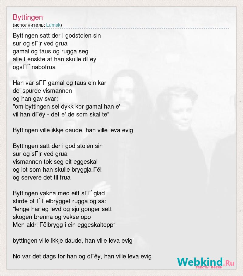 Byttingen satt der i godstolen sin sur og sær ved grua gamal og taus og rugga seg alle ønskte at han skulle døy også nabofrua Han var så gamal og taus ein kar dei spurde vismannen og han gav svar: "om byttingen sei dykk kor gamal han e' vil han døy - det e' de som skal te" Byttingen ville ikkje daude, han ville leva evig Byttingen satt der i god stolen sin sur og sær ved grua vismannen tok seg eit eggeskal og lot som han skulle bryggja øl og servere det til frua Byttingen vakna med eitt så glad stirde på ølbrygget rugga og sa: "lenge har eg levd og sju gonger sett skogen brenna og vekse opp Men aldri ølbrygg i ein eggeskaltopp" byttingen ville ikkje daude, han ville leva evig No var det dags for han og døy, han ville leva evig
