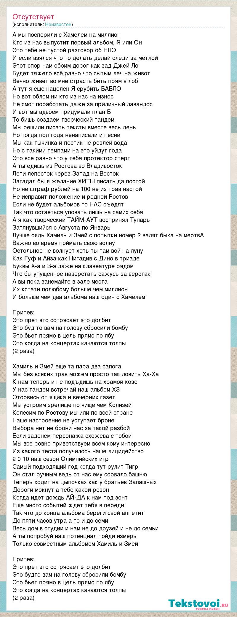 А мы поспорили с Хамелем на миллион Кто из нас выпустит первый альбом, Я или Он Это тебе не пустой разговор об НЛО И если взялся что то делать делай следи за метлой Этот спор нам обоим дорог как зад Джей Ло Будет тяжело всё равно что сытым леч на живот Вечно живет во мне страсть бить прям в лоб А тут я еще нацелен Я срубить БАБЛО Но вот облом ни кто из нас на износ Не смог поработать даже за приличный лавандос И вот мы вдвоем придумали план Б То бишь создаем творческий тандем Мы решили писать тексты вместе весь день Но тогда пол года ненаписали и песни Мы как тычинка и пестик не розлей вода Но с такими темпами на это уйдут года Это все равно что у тебя протектор стерт А ты едишь из Ростова во Владивосток Лети лепесток через Запад на Восток Загадал бы я желание ХИТЫ писать да постой Но не штраф рублей на 100 не из трав настой Не исправит положение и родной Ростов Если не будет альбомов то НАС съедят Так что остаеться уповать лишь на самих себя А я как творческий ТАЙМ-АУТ воспринял Тупарь Затянувшийся с Августа по Январь Лучше сядь Хамиль и Змей с попытки номер 2 валят быка на мертвА Важно во время поймать свою волну Остольное не волнует хоть ты там вой на луну Как Гуф и Айза как Нигадив с Дино в триаде Буквы Х-а и З-э даже на клавеатуре рядом Что бы упущенное наверстать сажусь за верстак А вы пока занемайте в зале места Их кстати полюбому больше чем миллион И больше чем два альбома наш один с Хамелем Припев: Это прет это сотрясает это долбит Это буд то вам на голову сбросили бомбу Это бьет прямо в цель прямо по лбу Это когда на концертах качаются толпы (2 раза) Хамиль и Змей еще та пара два сапога Мы без всяких трав можем просто так ловить Ха-Ха К нам теперь и не подъдишь на храмой козе У нас тандем встречай наш альбом ХЗ Оторвись от ящика и вечерних газет Мы устроим зрелище по чище чем Колизей Колесим по Ростову мы или по всей стране Наше настроение не уступает броне Выбора нет не брони нас за такой разбой Если заденем персонажа схожева с тобой Мы все ровно приветствуем всем кому интересно Из какого теста получилось наше лицидейство 2 0 10 наш сезон Олимпийских игр Самый подходящий год когда тут рулит Тигр Он стал ручным ведь от нас ему сорвало башню Теперь ходит на цыпочках как у братьев Запашных Дороги мокнут а тебе какой резон Когда идет дождь АЙ-ДА к нам под зонт Еще много событий ждет тебя в переди Так что до конца альбома береги свой аппетит До пяти часов утра а то и до семи Весь дом в студии и нам не до друзей и не до семьи А ты попробуй наш потенциал пойди измерь Только совместным альбомом Хамиль и Змей Припев: Это прет это сотрясает это долбит Это будто вам на голову сбросили бомбу Это бьет прямо в цель прямо по лбу Это когда на концертах качаются толпы (2 раза)